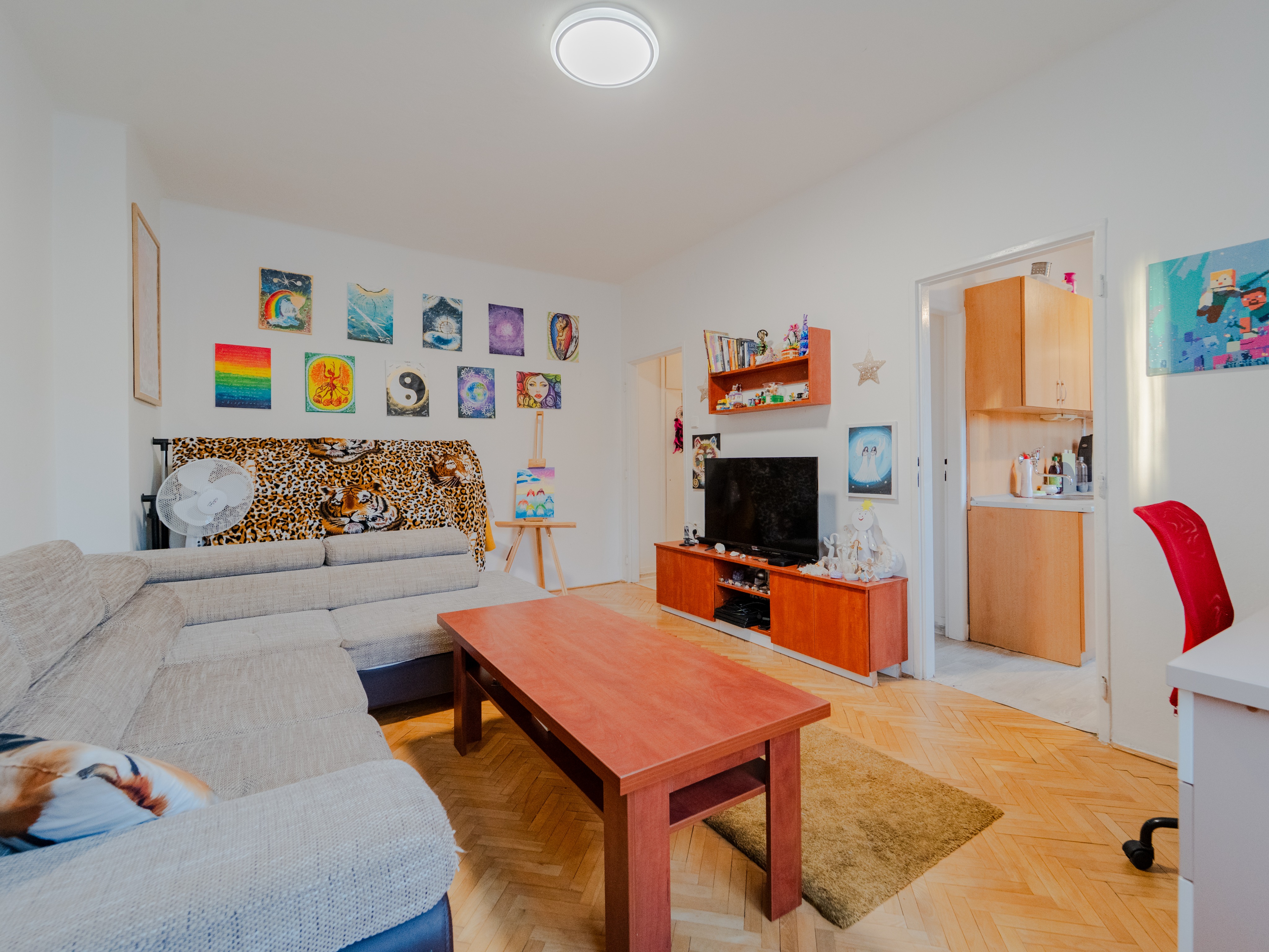 vyma obrazy ze zdi odstran veci za pohovkou odstran veci z kuchynske linky a vy isti prostor u televize