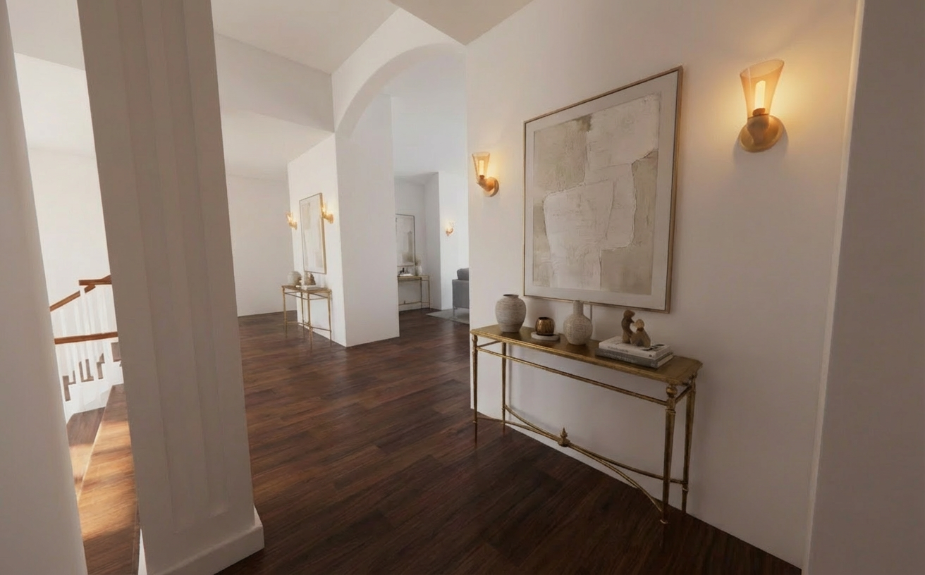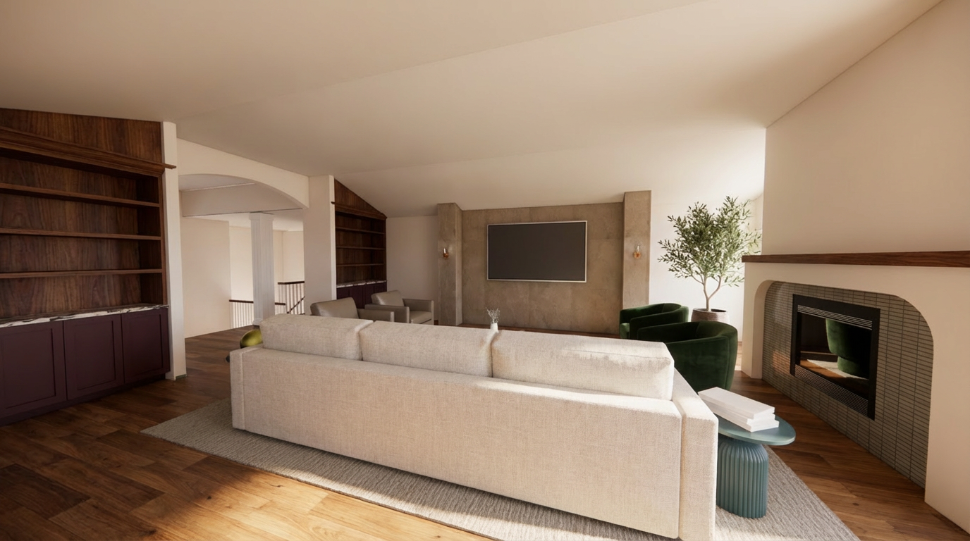 replace the blue accent table with a brass one match the top of the bookshelves with the burgundy base cabinets below and add decor to the shelves add artwork to the tv and a decorative frame to match the samsung frame tv add an antique gold arch framed mirror and additional decor on the fireplace mantel