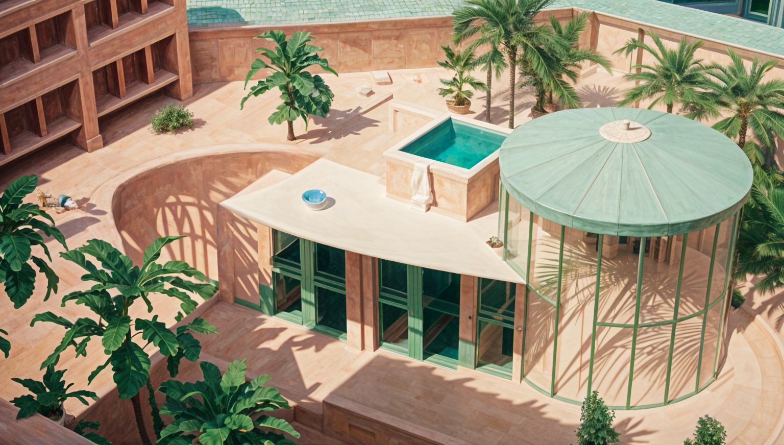 sand stone shop facade palm trees greenery cafee on the rooftop shoping center surrounding grey and yellow tones architecture
