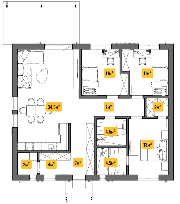 top view add furniture remove sizes and yellow blocks change r small room into a boiler room change right small middle room into awardrobe with door to master bedroom