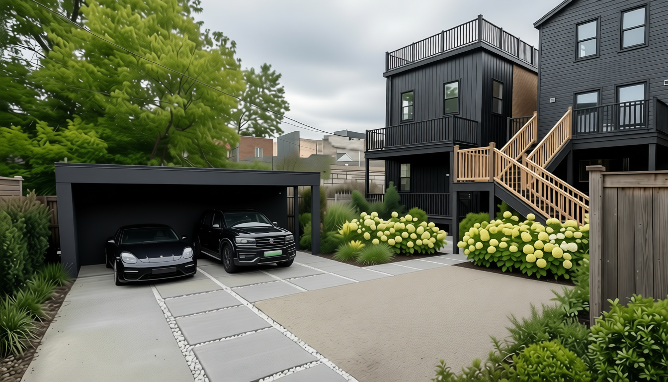 a photorealistic architectural rendering of a luxurious open plan modern kitchen dining and living space the kitchen features matte charcoal black lower cabinets and tall pantry units contrasted with warm light oak upper cabinets with glass fronts and integrated warm led lighting a large central island with a light oak base and a thick white calacatta marble countertop with waterfall edges serves as a focal point the backsplash is matching white marble high end appliances including integrated ovens and a large induction cooktop are visible a long solid walnut dining table surrounded by cognac leather upholstered chairs is set with ceramic tableware glassware and a centerpiece of greenery and candles the living area includes a large plush beige velvet sofa on a textured area rug a marble coffee table with curated books and decor and contemporary art on the walls wide plank light oak flooring runs throughout the space large floor to ceiling windows on one side allow soft natural daylight to flood the room supplemented by recessed ceiling lights and pendant fixtures the overall atmosphere is sophisticated warm and inviting 8k resolution highly detailed interior design