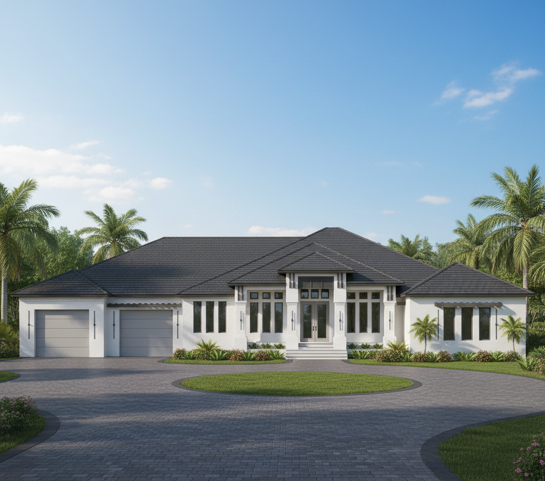 make as photorealistic as possible while keeping textures the same as selection professional landscaping in a lightly wooded scene with good lighting light grey horizontal siding dark roof