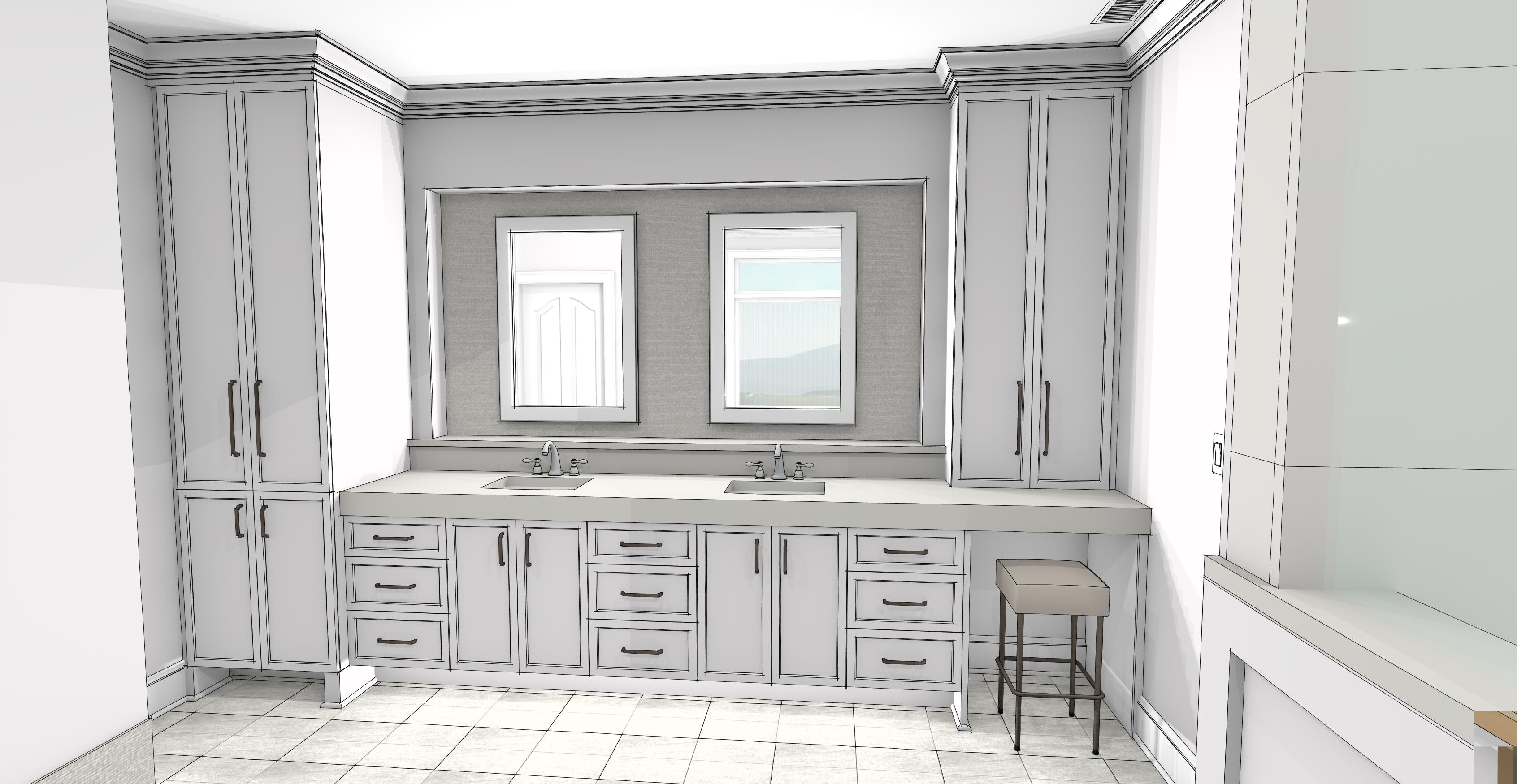 soft white cabinets with quartz countertop add lighting to mirrors and around edge of recessed area around mirrors to create ambient lighting add ambient lighting to cabinet toe kick