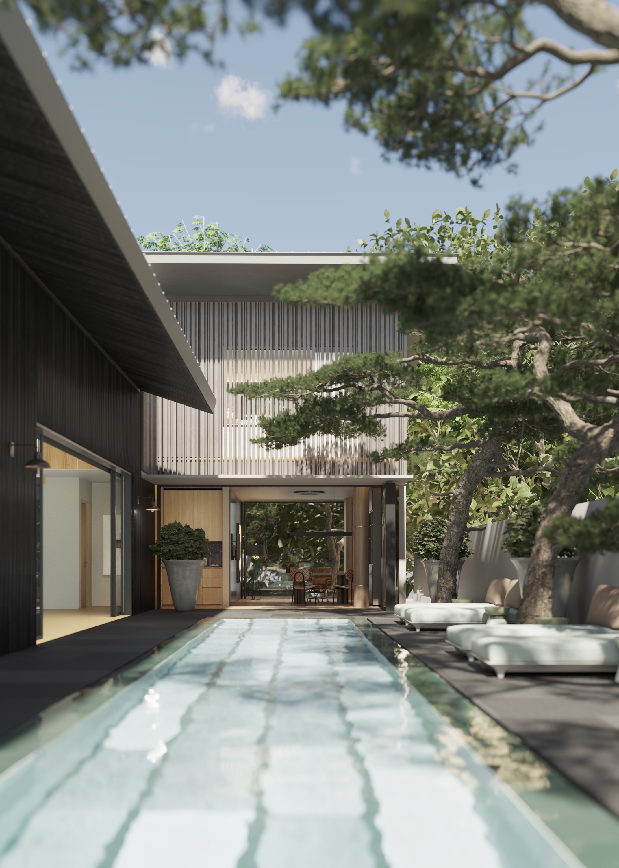 enhance the realistic texture and night lighting set indirect artificial lighting for the outdoor area and neighborhood maintain the elements material and angle of the picture do not set lighting in the roof