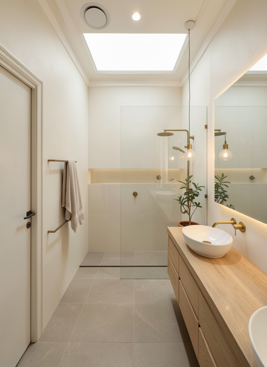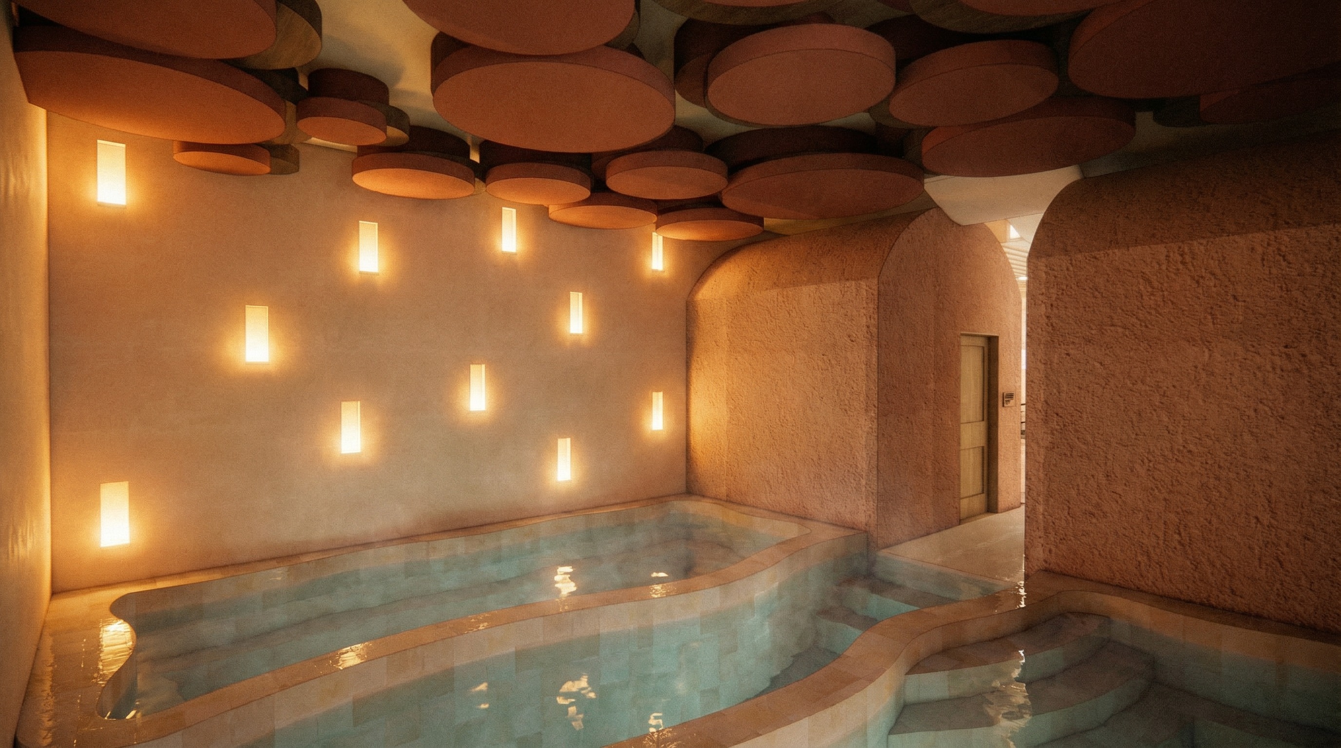 priority overrides these elements must be executed exactly as described before anything else in this prompt is interpreted one every small rectangular wall niche is visibly and warmly glowing the niches are recessed into the smooth plaster wall in a scattered organic grid pattern across the left and back walls each niche emits a strong warm amber gold light from within the interior of each niche is fully illuminated casting a soft warm spill of light onto the surrounding plaster wall surface around it creating a halo of warm tone on the wall face the glow from each niche is rich and visible like a candle or low wattage warm bulb behind frosted glass the niches are the primary light source in the space and their cumulative glow across the wall surface creates the main ambient warmth of the room between niches the wall is slightly shadowed giving the wall surface rhythm and depth this is non negotiable two both pools are filled with real looking still thermal water the water surface is highly reflective and slightly translucent it mirrors the warm amber ceiling elements and wall niches above in a distorted organic way like a hot spring at rest the water has gentle depth you can see the pale stone tile pool floor through the water with a slight blue green thermal tint deepening toward the center the water surface has micro ripple texture catching the warm niche light in tiny highlights the water reads unmistakably as hot mineral and alive not empty not a flat surface not glass steam is barely suggested as a very faint atmospheric haze sitting just above the water surface three the floor feature between and around the pools is a shallow water floor a thin film of still water sits over the same pale stone tile as the pool surround creating a wet reflective mirror surface at floor level this floor reflects the ceiling the glowing niches and the pool edges in a soft distorted way the boundary between the shallow floor water and the deeper pool water is readable but gentle the overall effect is of the entire floor plane being one continuous water feature at different depths preserve all existing materials and spatial layout exactly as shown in the reference image do not replace recolor or reinterpret any surface finish walls on the left and back are smooth hand applied clay plaster in a warm terracotta blush tone pale peach to warm sand in color not orange not pink the plaster surface has visible hand troweled texture soft undulating marks slight variation in surface thickness organic imperfection consistent with artisan lime or clay plaster application the plaster reads as matte slightly chalky and tactile the right and rear architectural walls and arched partition elements are rough textured clay or adobe plaster in a deeper warm terracotta brown tone heavily textured granular and rustic like rammed earth or raw adobe block surface the arch openings lead to a warmly lit corridor beyond with a walnut wood door visible the texture contrast between the smooth left wall plaster and the rough right wall plaster is a key spatial quality preserve it exactly ceiling is composed of large clustered circular terracotta toned acoustic or decorative discs overlapping organic cloud like groupings of cylindrical pads in warm burnt sienna and clay red tones suspended at varying heights the ceiling discs catch warm light from below and cast soft shadows between clusters the ceiling reads as rich warm and dimensional pool surrounds steps and coping are clad in pale warm stone or travertine look square tiles creamy beige to blush tones with subtle variation between tiles matte finish laid in a grid steps descend into both pools with clearly readable tile edges the walnut wood door in the background arch has a warm honey brown grain finish with a small access control panel mounted beside it the corridor beyond glows softly warm overall color temperature is warm amber and terracotta the space feels like a subterranean thermal grotto intimate and elemental no cool or blue white light anywhere except the subtle thermal tint of the pool water depth post processing and finish heavy coarse analog film grain consistent throughout the entire image grain is coarse visible and dominant across all surfaces including the water reflections plaster walls and ceiling discs identical in quality to kodak portra 800 pushed two stops in low light color is muted and slightly desaturated rich but not vivid shadow tones are softly lifted blacks not fully crushed warm vignette darkening all four edges and corners of the frame the image reads as a medium format film photograph scanned from print tactile analog and imperfect collage editorial quality each material surface feels individually photographed and composited by hand onto the scene the water reflections have a slightly graphic almost printed quality beautiful and realistic but with the flatness of a collage cutout feels printed on uncoated matte paper stock not a clean cgi render not digital handmade editorial architectural mood board aesthetic two the wall niches do not emit stark bright or clinical light each niche glows exactly like a small candle or tea light placed inside a shallow recess the light is extremely warm amber gold almost flickering in quality low in intensity and intimate the glow barely spills beyond the immediate edge of each niche opening the wall between niches is mostly in soft shadow with only the gentlest warm blush of reflected candlelight touching the surrounding plaster the niches feel like votive candles set into a cave wall sacred quiet and moody not bright not white not architectural downlights the overall wall reads as mostly shadowed with small warm amber embers of light distributed across its surface three the overall room lighting is moody dim and atmospheric the primary light sources are only the candle like niches and the soft reflection of warm light off the water surfaces the room should feel like a candlelit thermal grotto at night rich sh