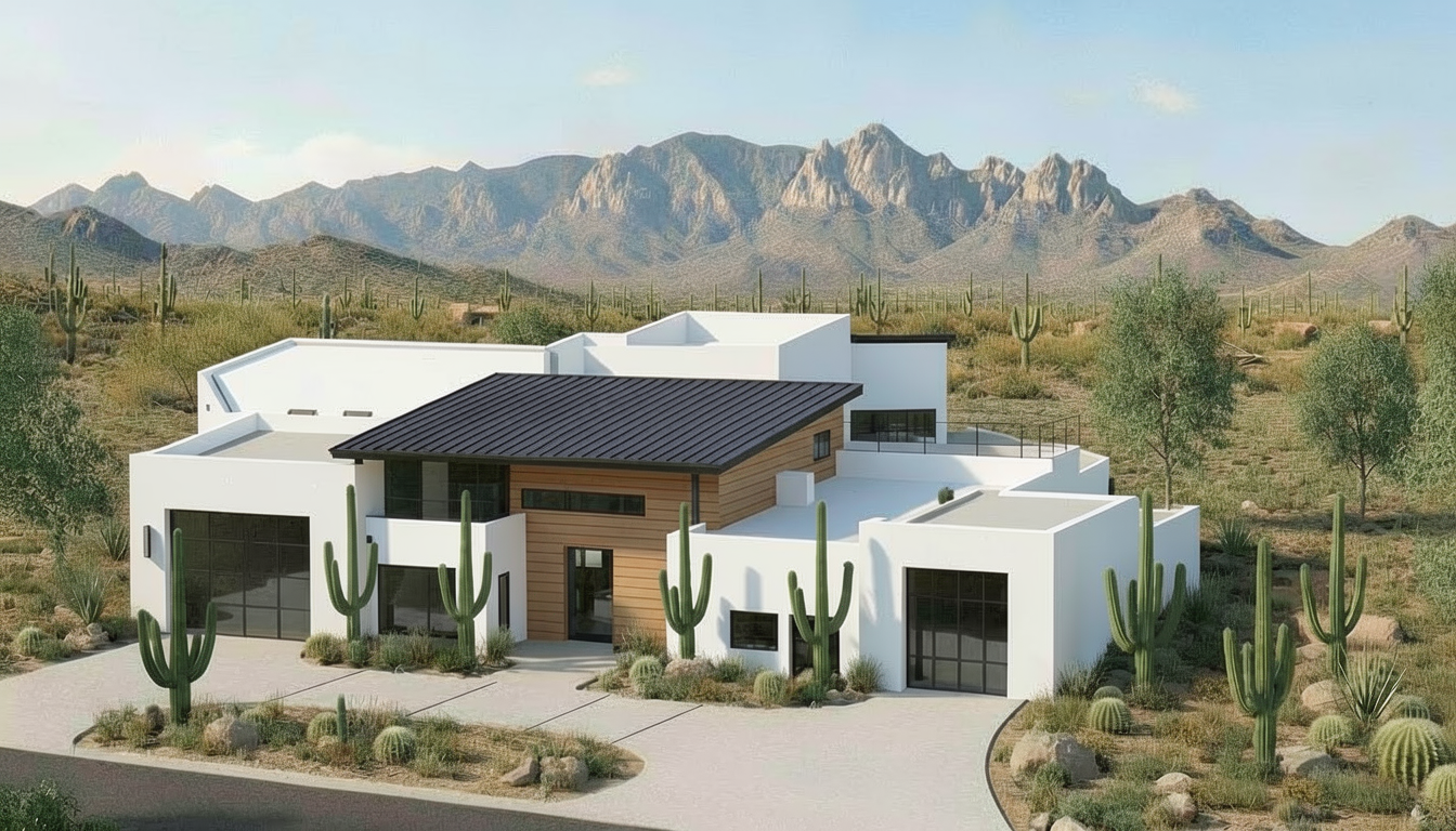 keep the structure of the home the same only apply stone cladding to two masses of this structure the stone cladding is attached for your reference the first mass to have stone cladding is the mass to the very left it has a garage apply stone cladding on this mass not on the mass to the right of it that has white stucco and an outdoor deck above the second mass that will have stone cladding is to the right of the wood cladded mass only apply stone cladding to this mass and not on the mass to the right of it which also has another garage this garage mass which is the farthest right mass will stay in the white stucco keep the landscape and background the same