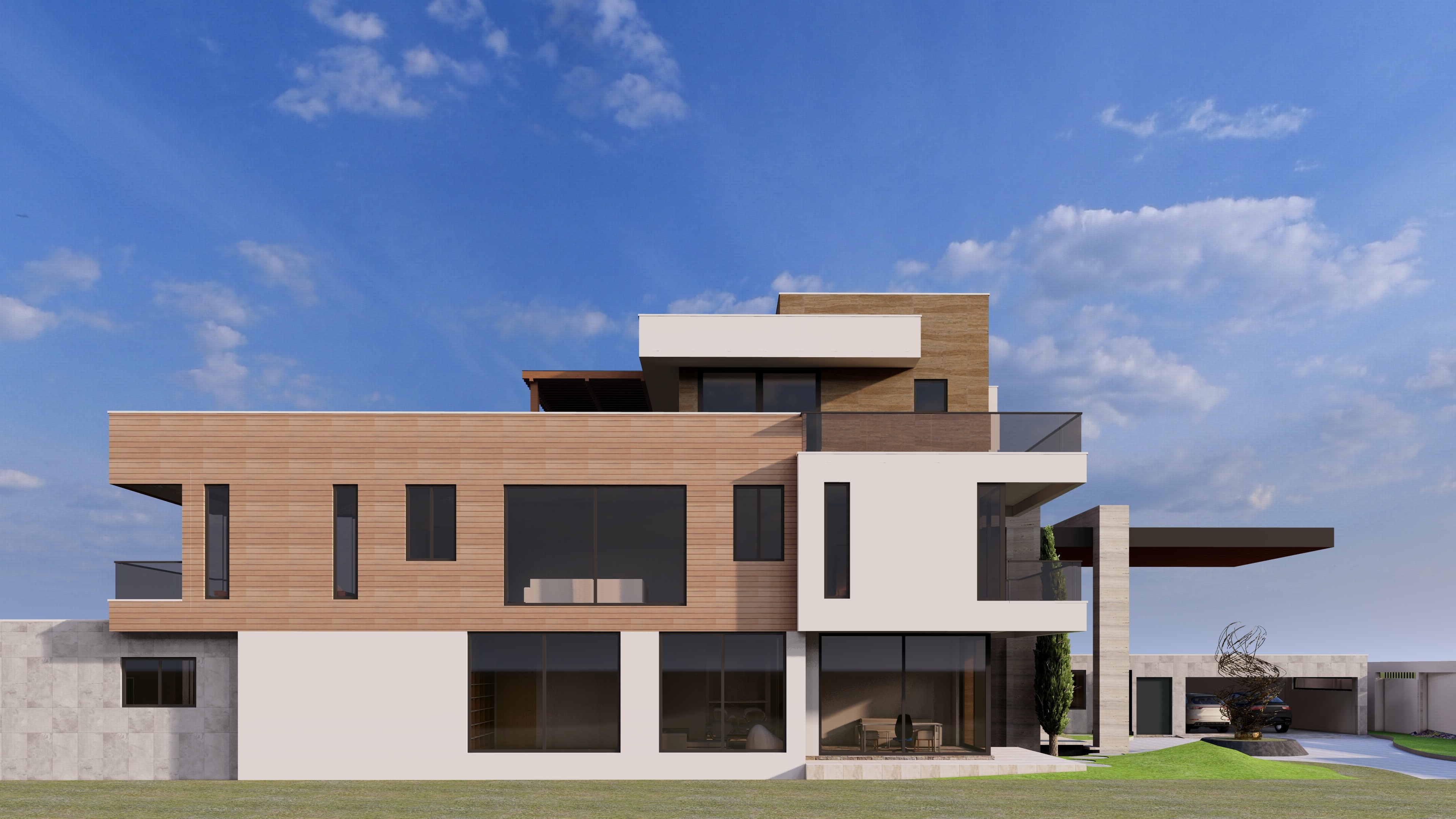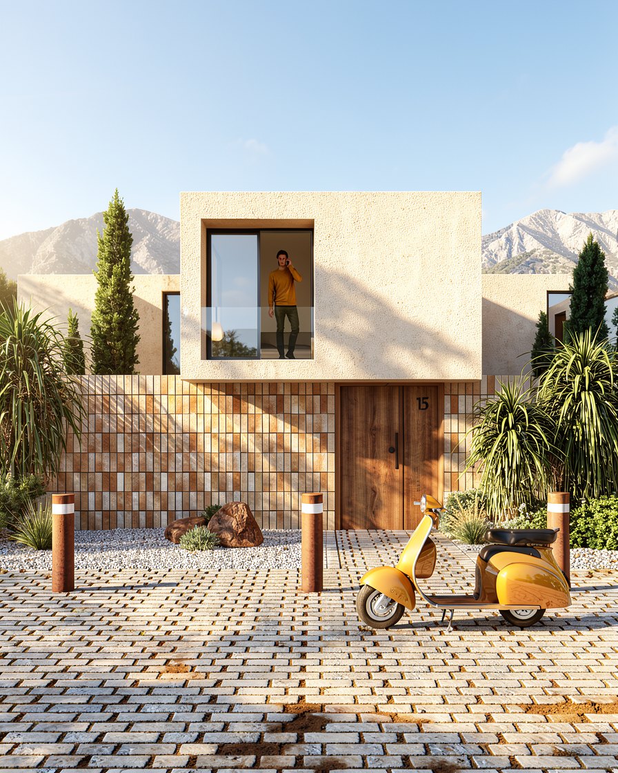 model of a house add very few trees in far far background for context add few vegetation with very very few floral ones for context should look lived in