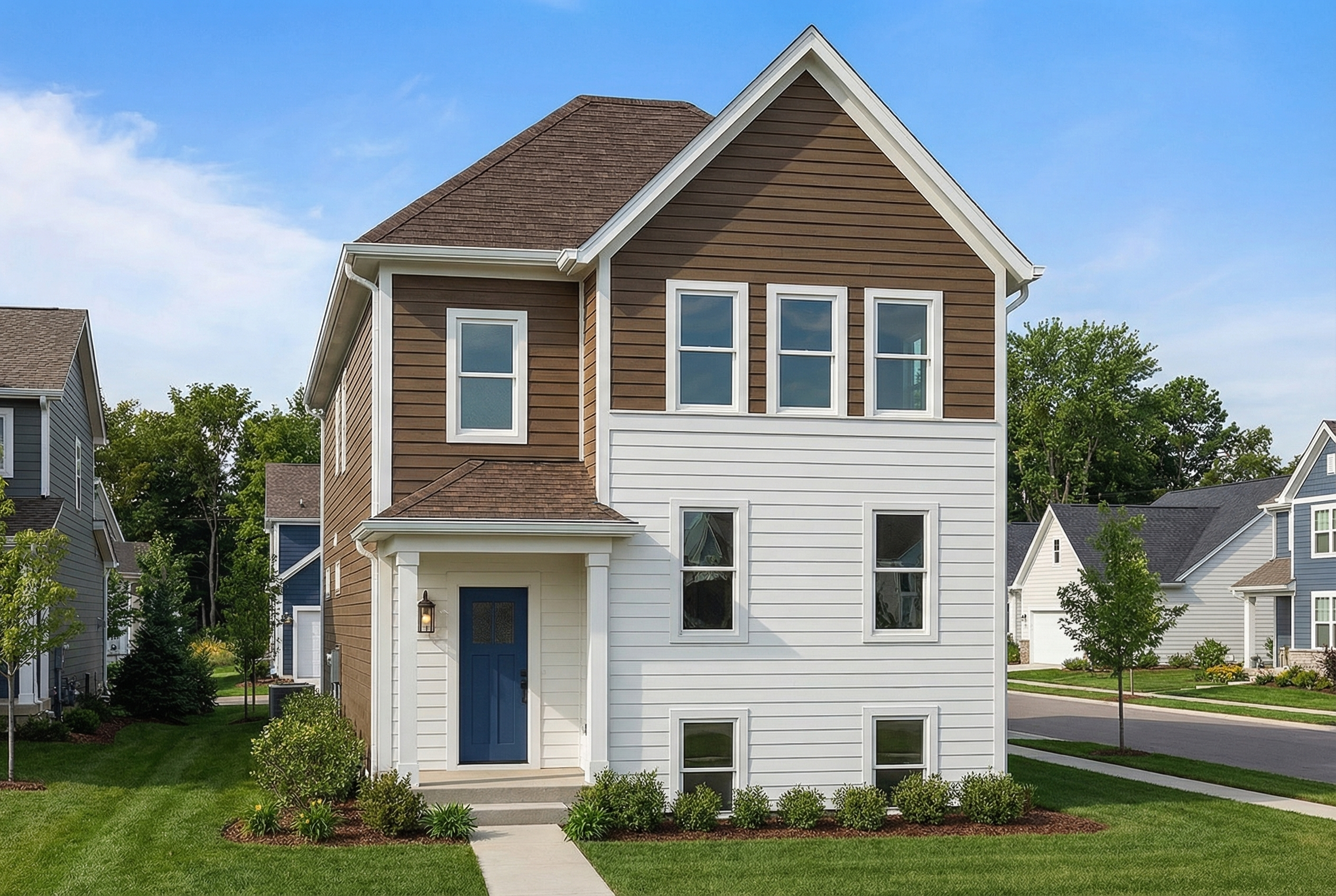 keep everything the same but change the front door color to sheriwn williams tricorn black and make sure all the windows have black trim