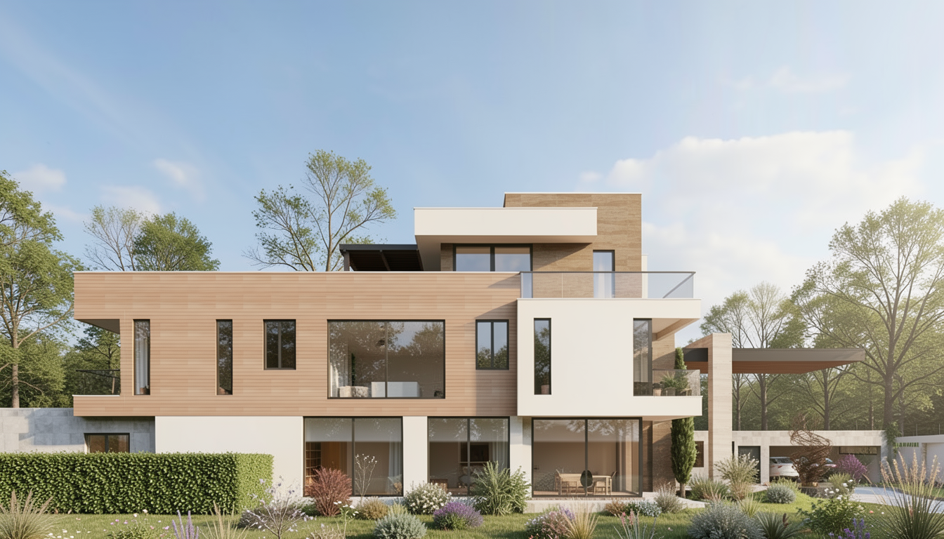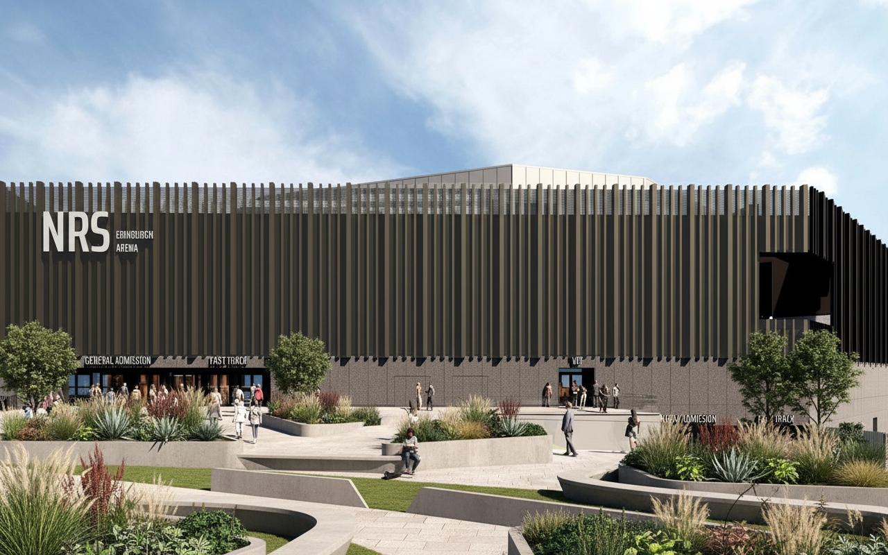 in front of the building add solid concrete benches with some concrete planters with long grasses and contemporary planting the layout should be inspired by the linear facade