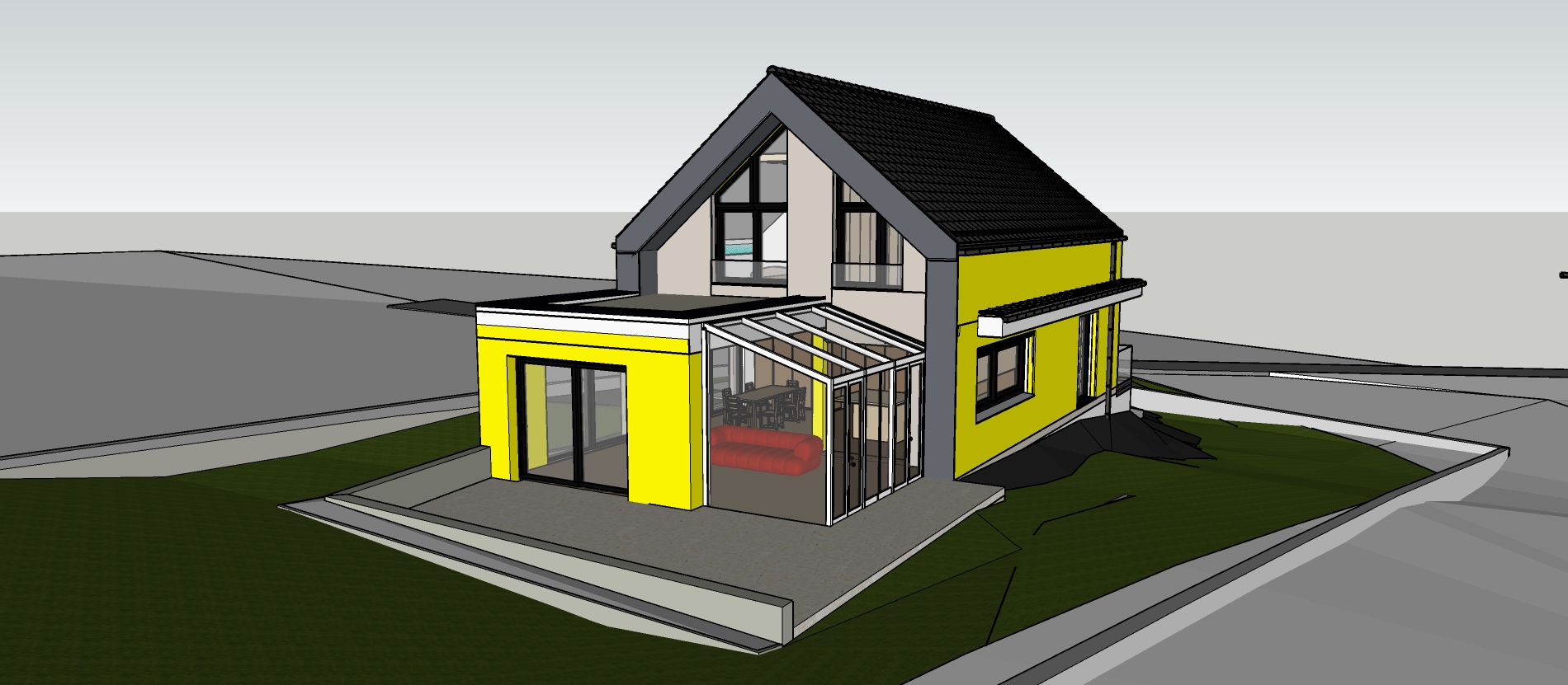 create a realistic render of this image add stone cladding to the yellow walls and make the glass extension very modern looking