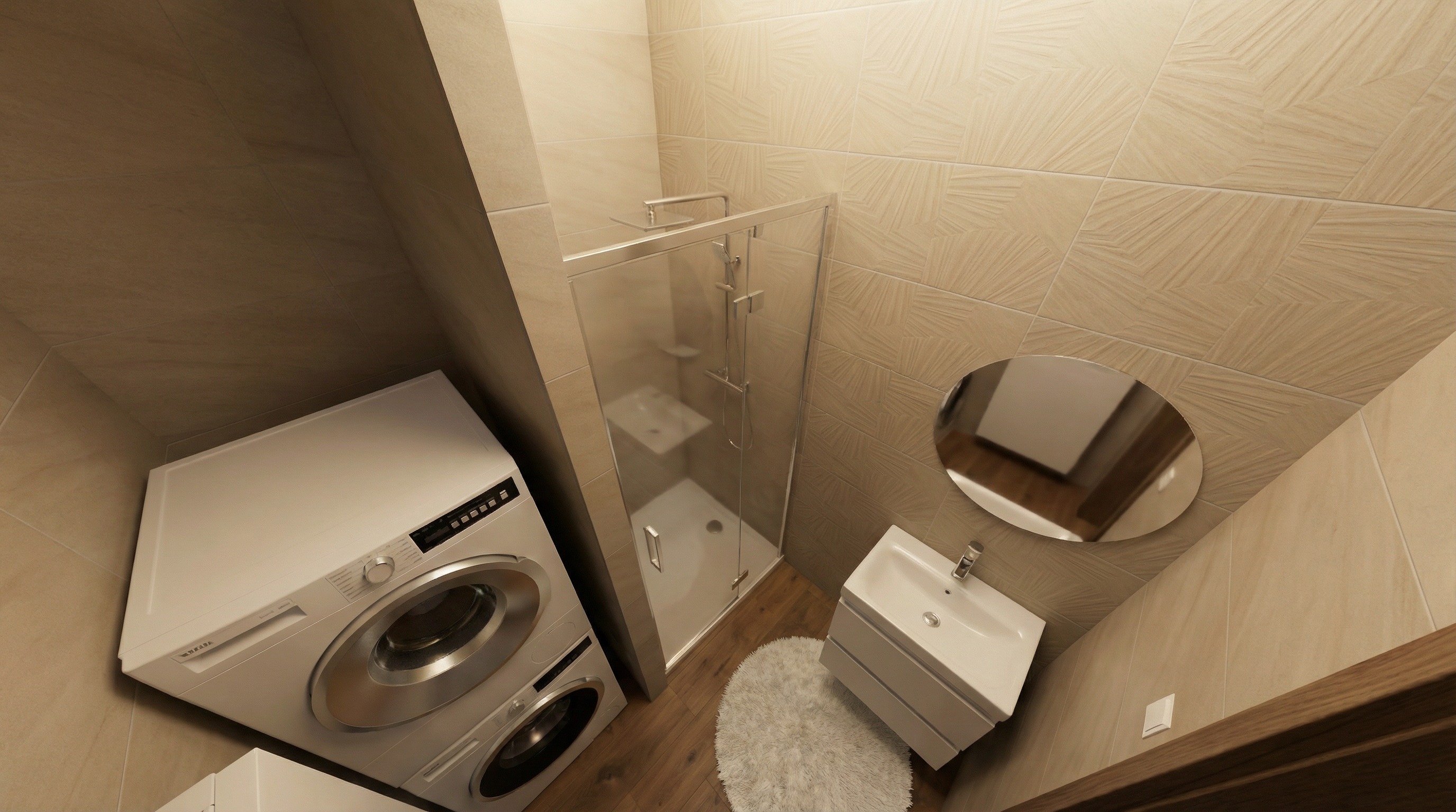 maintain original colors do not add additional items floor tile cersanit sandwood brown lighting natural without window some water drops on shower door