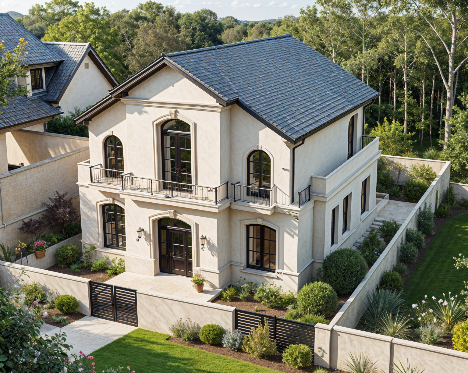 classic style home with some horizontal profiles under the roof install classic style frames on windows and doors black windows frames and black door frames black front gates