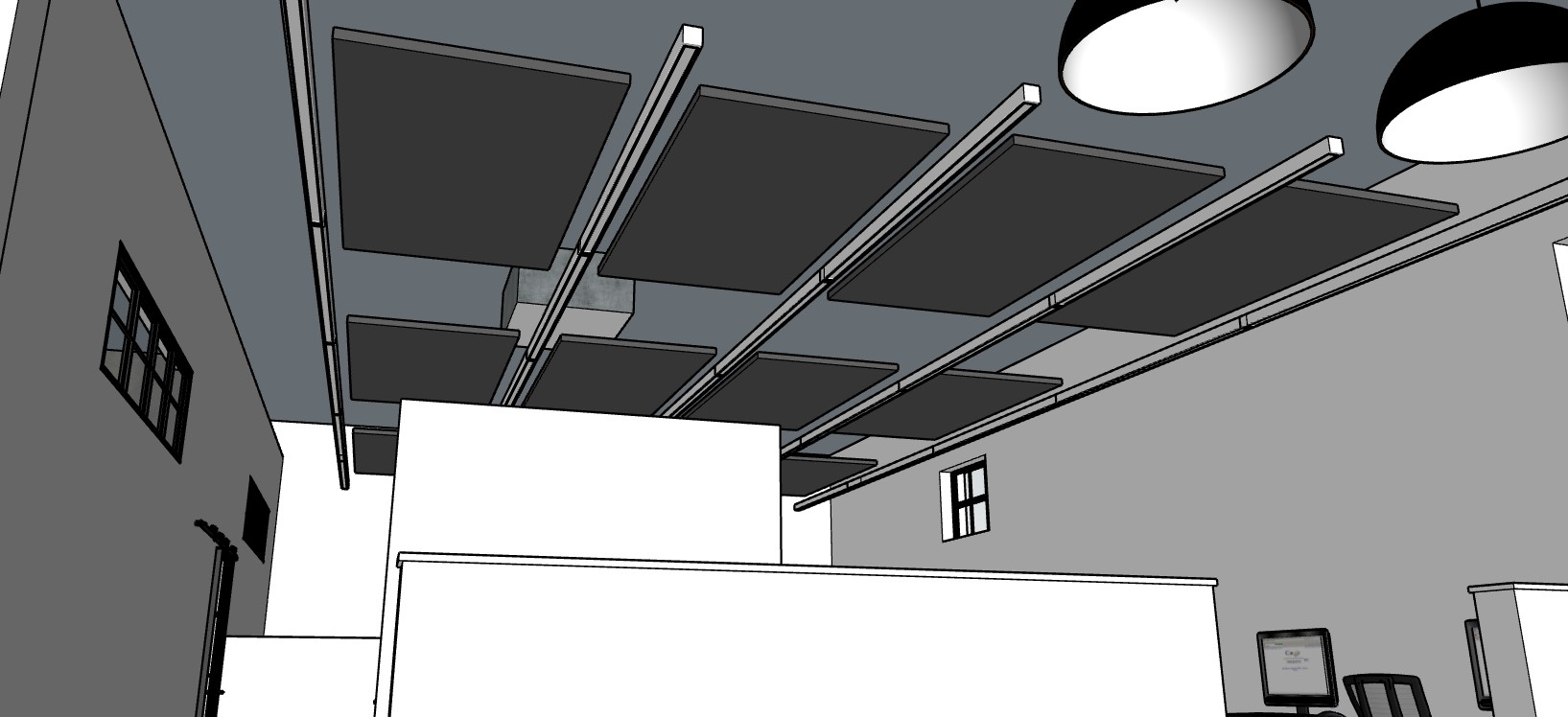 ceiling deck gray acoustic panels in ceiling gray lights 4000k keep all walls and top of wall white no natural light from windows