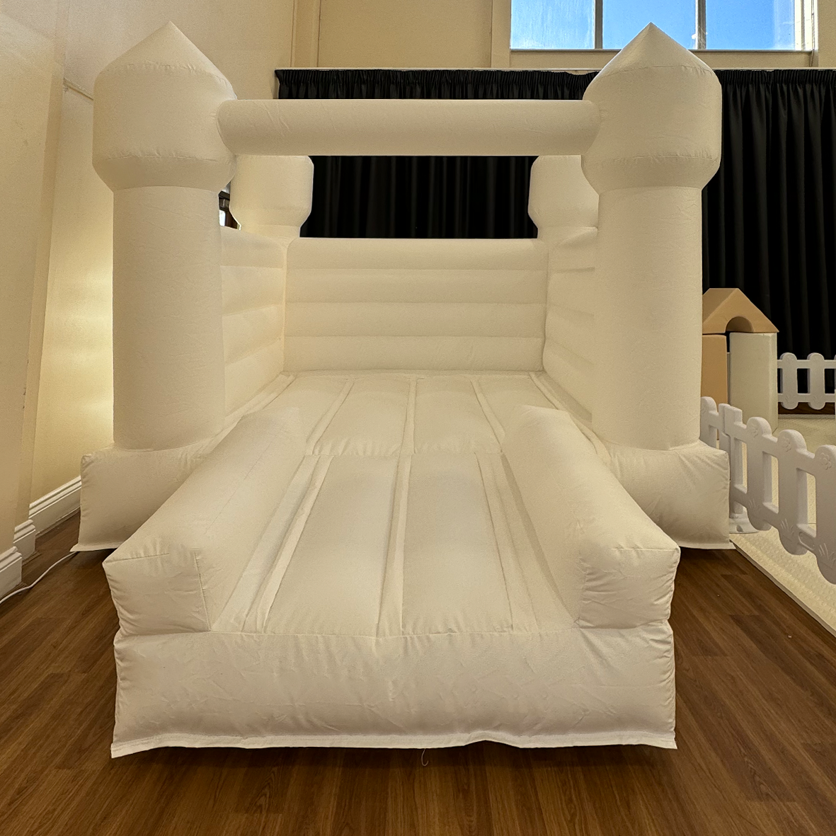 bouncy castle located in an wedding venue courtyard in summer child bouncing on the bouncy castle wedding guests drinking champagne from the bar