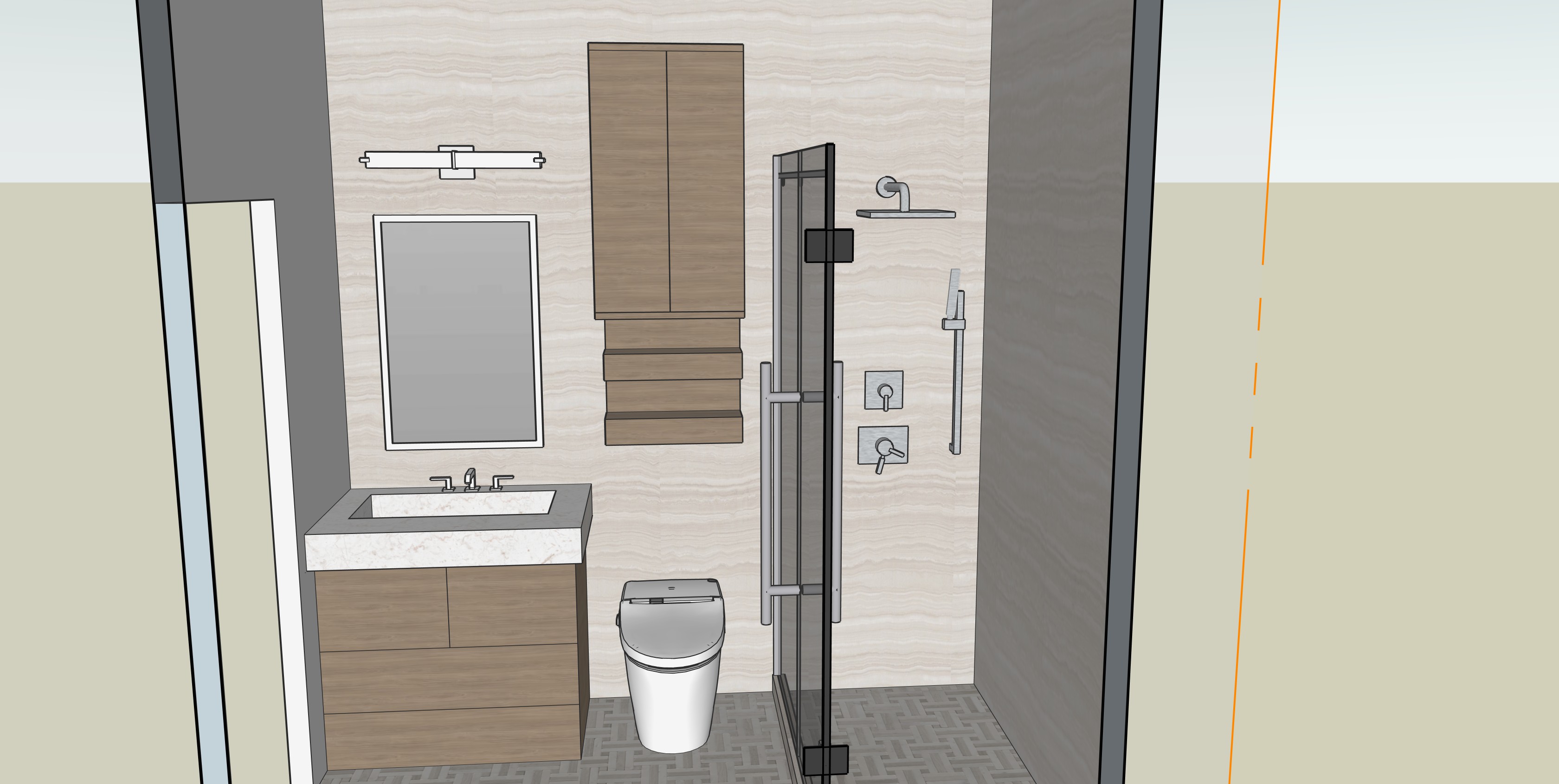 turn on the vanity light and add integrated led lighting in the shelves and under the hutch over the toilet and turn on the recessed lights do not take the hutch all the way to the ceiling make the frame around the mirror in polished silver and add backlihgting behind the mirror make all of the lights warm 400k