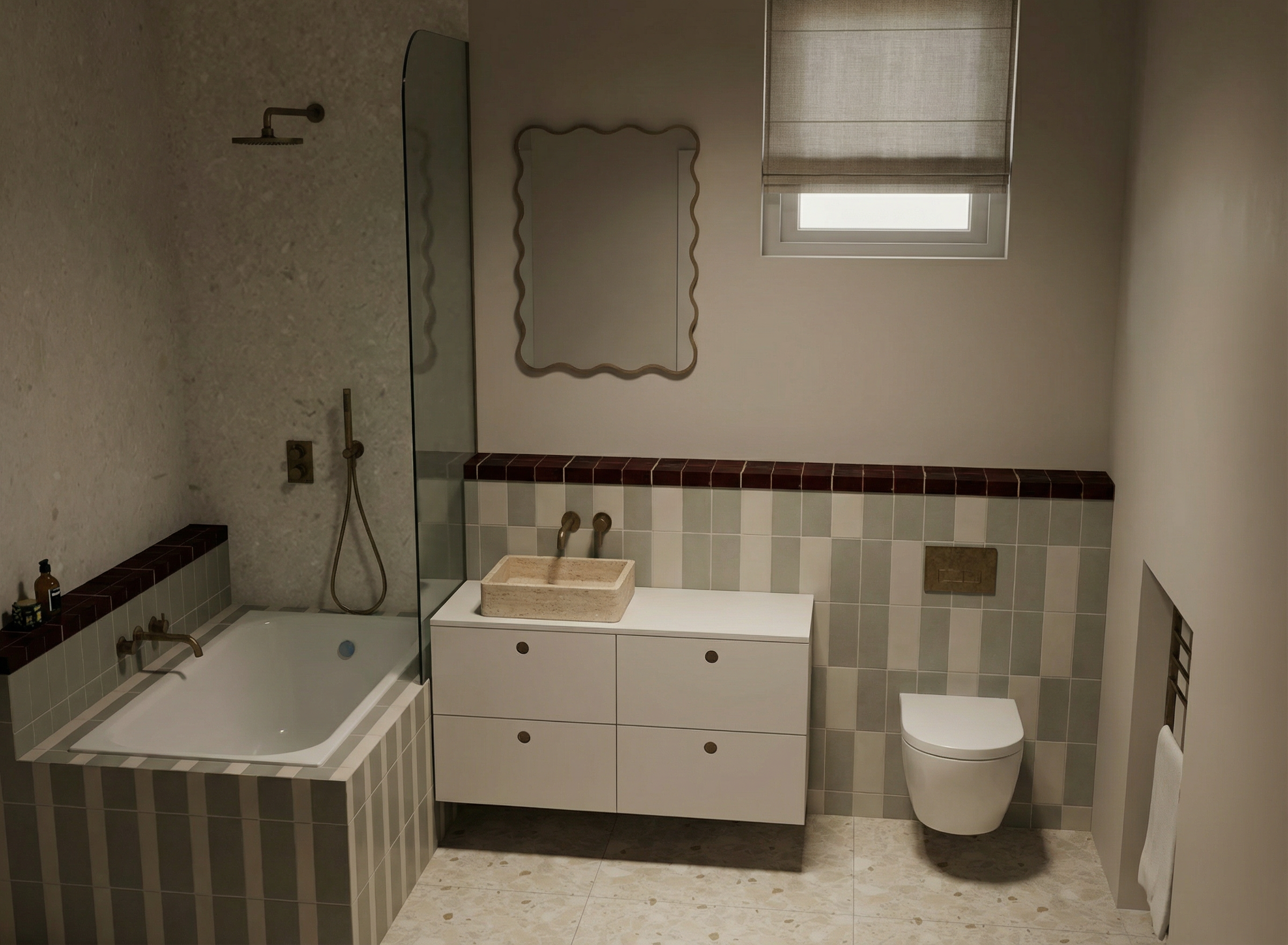the sink is in beige travertine the floor is in light beige terrazzo like this one https www asdecarreaux com 29503 carrelage imitation ciment et terrazzo ninov mona rectifie beige 80x80 128 m html utm source google utm medium cpc utm campaign 5bpmax 5d 5bhm 5d 50 utm id 21290223769 gad source 1 gad campaignid 21286339136 gbraid 0aaaaadsggbcqtztpsc0sg9xcbce2zp8on gclid cj0kcqjwv lobhcdarisam5hdkdeh8flvcawyizpzdcuexdtykcweidtcoin7vtzwqeinz5jvyc3fjuaao6xealw wcb the tiles of the bathtub are light greige and light grey green the dark top of the tiles is in bordeaux tiles like these https www leroymerlin fr produits zellige marocain 5x5 cm carrelage mur terre de zellige vendu a plaque 30 x 30 cm prix indique a plaque marron fonce 07 92850626 html megaboost at medium sea paid at campaign pd 06 soletcarrelagemural pmax shp pla top 3p at source google at market m4 at section r6 at campaign id 20490834400 at campaign type pmax at account leroymerlin marcheprojetdeco at account id f149fwwg gclsrc aw ds gad source 1 gad campaignid 20486532698 gbraid 0aaaaadgndyuwoacjoaum4iobvba zuq9z gclid cj0kcqjwv lobhcdarisam5hdkcx6pncletb59i0crvhtw7klg1pq6ly9uhxcqhx0n6ipsjhm0q0yjiaai6dealw wcb