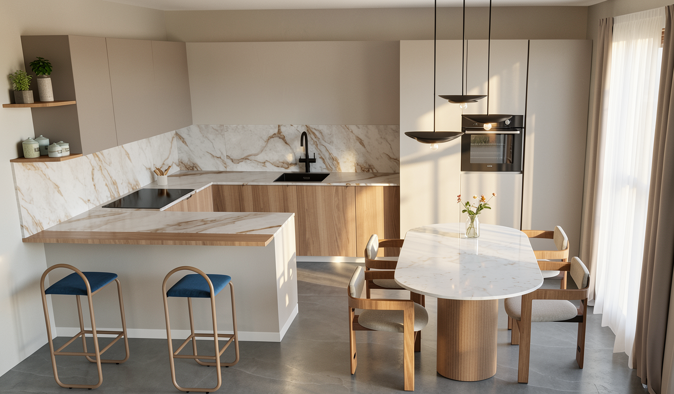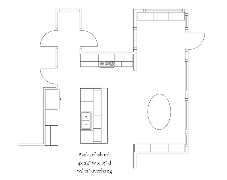 convert this floor plan into a realistic isometric 3d view of a kitchen show the space from an elevated angle with furniture walls and details visible white and black 1x1 floor tiles with a border off white kitchen cabinets with a dark walnut kitchen island with seating for 4 use the same furniture as shows on the plan do not change the orientation of the floorplan