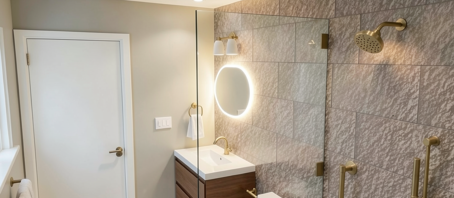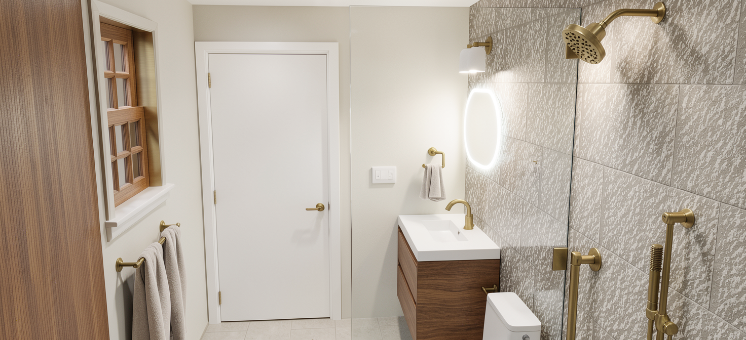 preserve all existing geometry materials and proportions the mirror has a soft white backlit halo 3000k evenly diffused the shower head and all shower fixtures are not light sources and emit no light no lighting exists within the shower or niche the back wall wood panels remain unchanged overall scene is evenly brightened using neutral 3500k ceiling lighting only do not add highlights glow reflections or new light sources all fixtures and accessories have a brushed brass finish