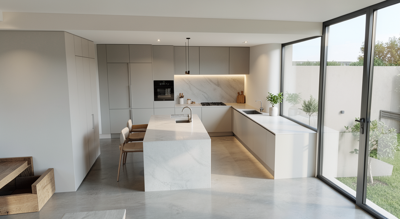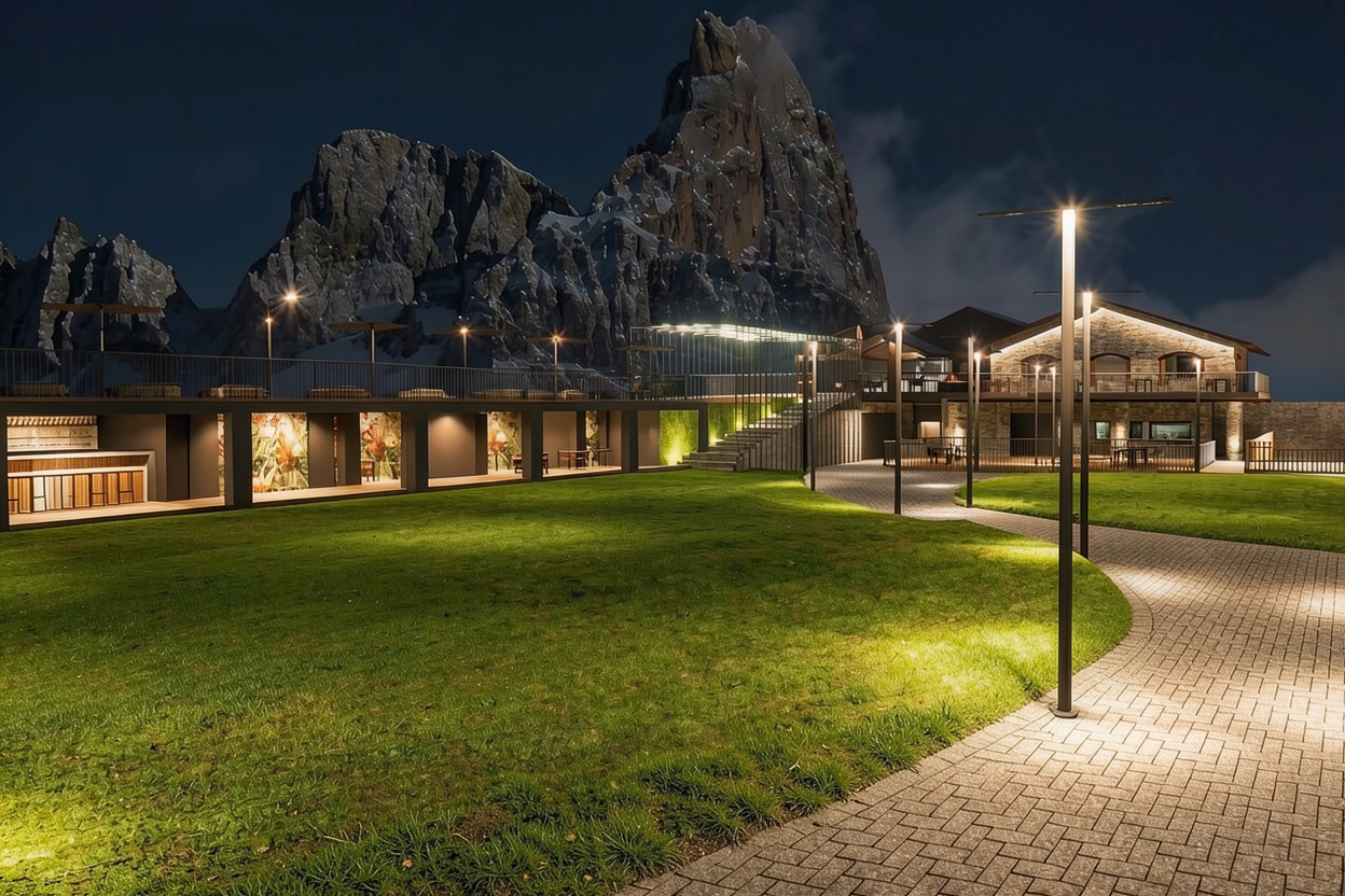 use this image as the base modify the circular structure to become a permanent outdoor commercial bar building scale and proportions increase the overall diameter so the structure appears large and architectural comparable to a small standalone building total diameter approximately 10 meters central circular bar 6 meters diameter the structure must feel spacious and functional for real service operations integration with the ground remove the decorative circular pavement around the structure integrate the building directly into the lawn so it appears fixed and permanent not placed temporarily keep the existing grass layout and paths unchanged architecture structure in dark oak wood full height glass walls dark grey roof roof with a thinner more architectural profile less decorative interior important inside create a professional circular bar layout central working island bottle storage refrigeration and working surfaces bar counter for customers around the perimeter functional lighting for a real bar environment not lounge seating preserve camera position and perspective night lighting atmosphere buildings mountains paths grass colors and materials photorealistic result minimal intervention modify the circular structure only
