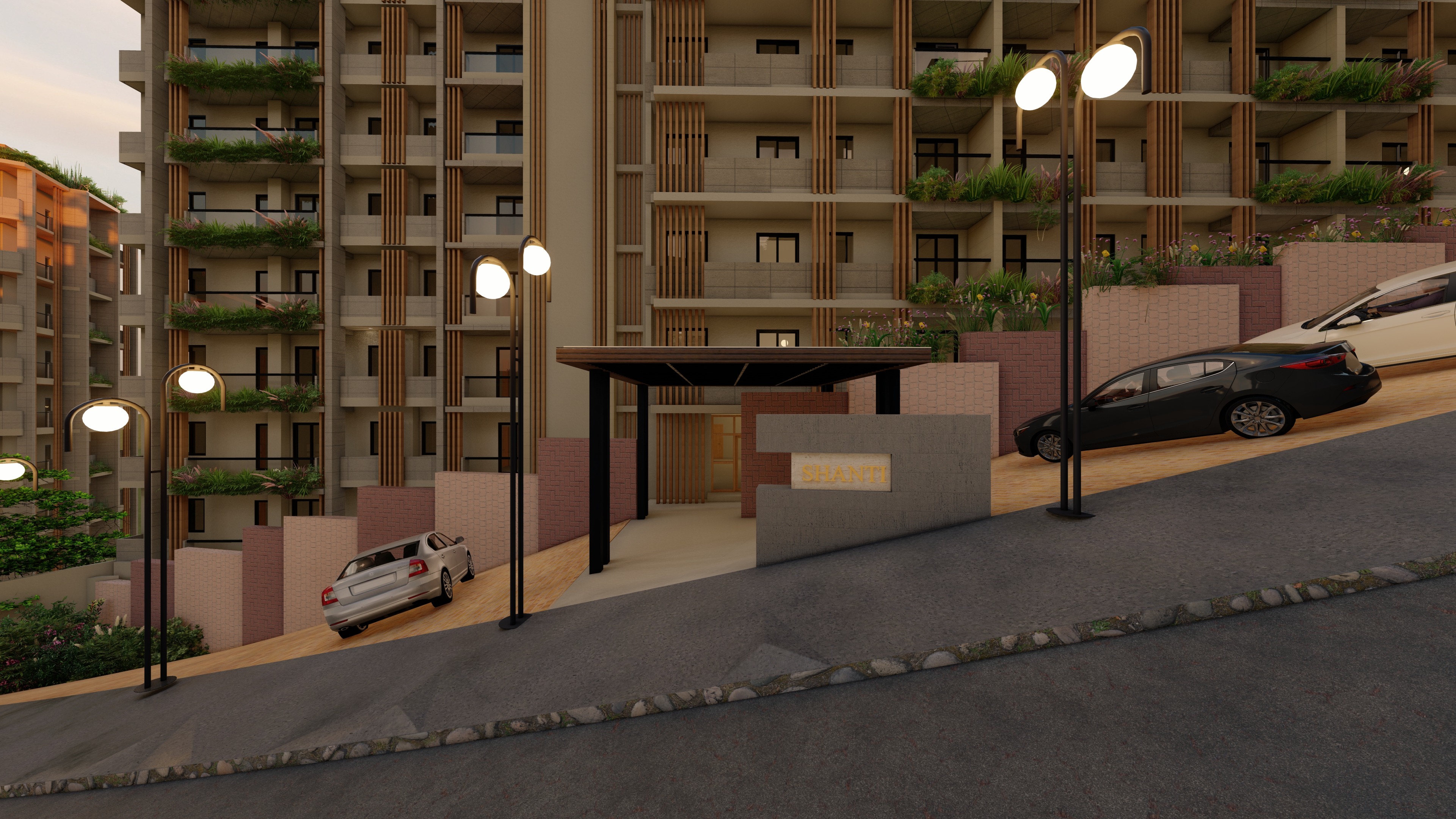 asphalt road and concrete sidewalk sunset lighting modern contemporary materials in warm gray tones wood slats in the facade cinematic photorealistic 4k resolution 16mm camera lens san mateo rizal valley in the far background add planters hanging plants in every balcony looks like a real estate photograph not a 3d render looks like a real estate photograph not a 3d render do not alter the signage at the front