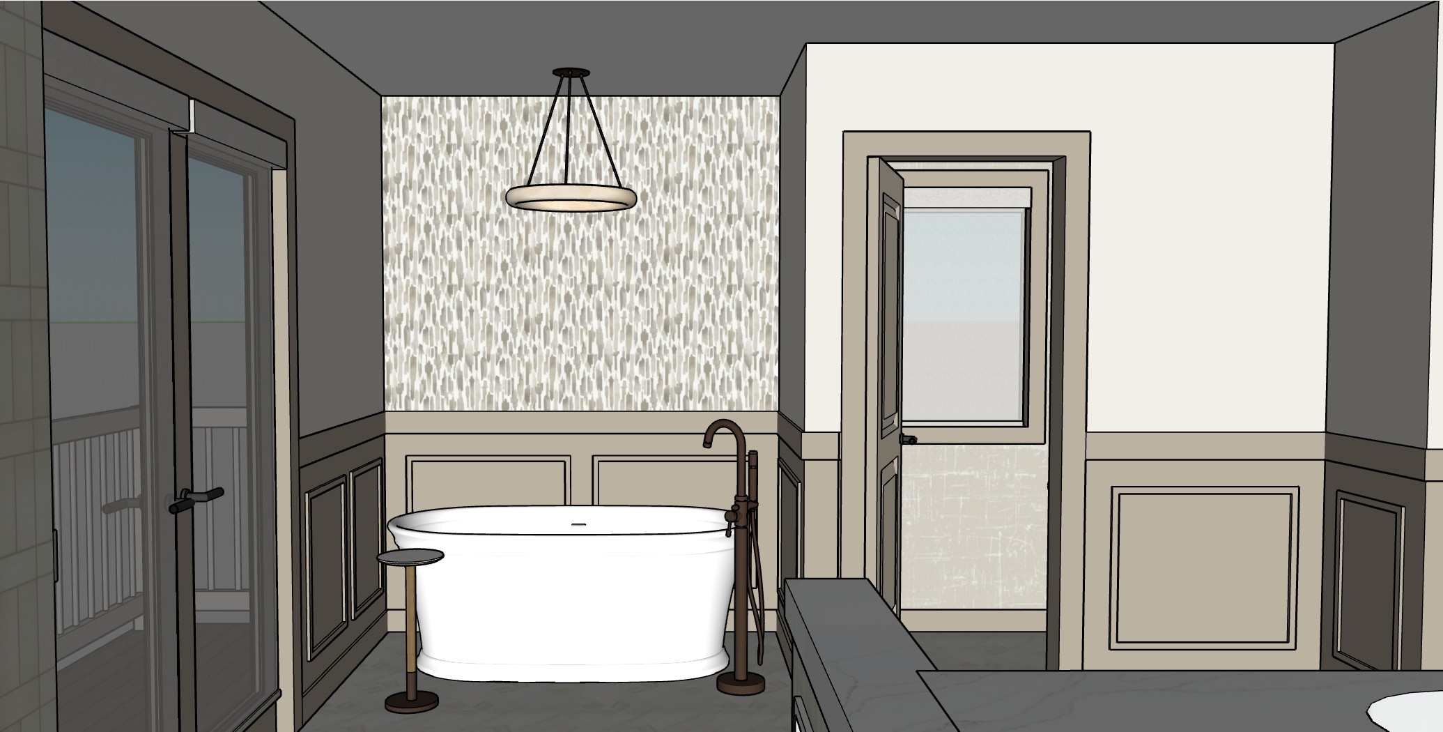 please make this photorealistic the flooring is a 3 x12 polished marble inspired tile laid in a herringbone pattern the chandelier is alabaster and the fixtures are all a champagne bronze only the back wall behind the tub has a wallpaper above the molding pluie by york wallcoverings pattern lm5404 the windows have a light filtering roller shade do not show any towel bars on the walls the shower tile is a soft white the countertops are a white quartz with soft and subtle beige veining the doors and casing are the same color as the lower half of the molding which is pashmina by benjamin moore add some background behind the windows and roller shades