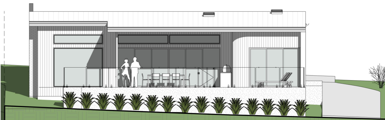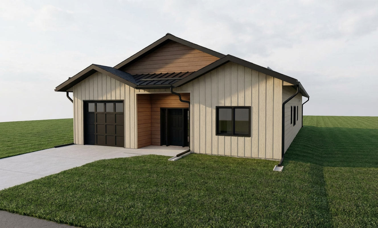 have a light warm external timber paneling on the walls have the roof and trim colours be a beige with a driveway on the right