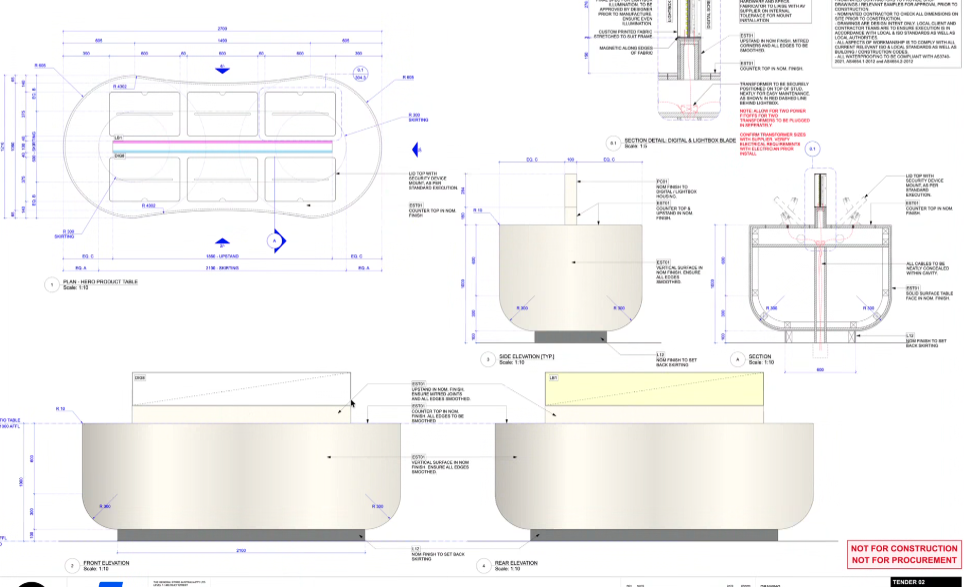 use these architectural drawings to create a retail display table that showcases tech products the base is white stone the blade in the centre is a double sided digital screen place in a high tech retail enviroment with soft white walls and grey marble flooring include natural lighting and shadows