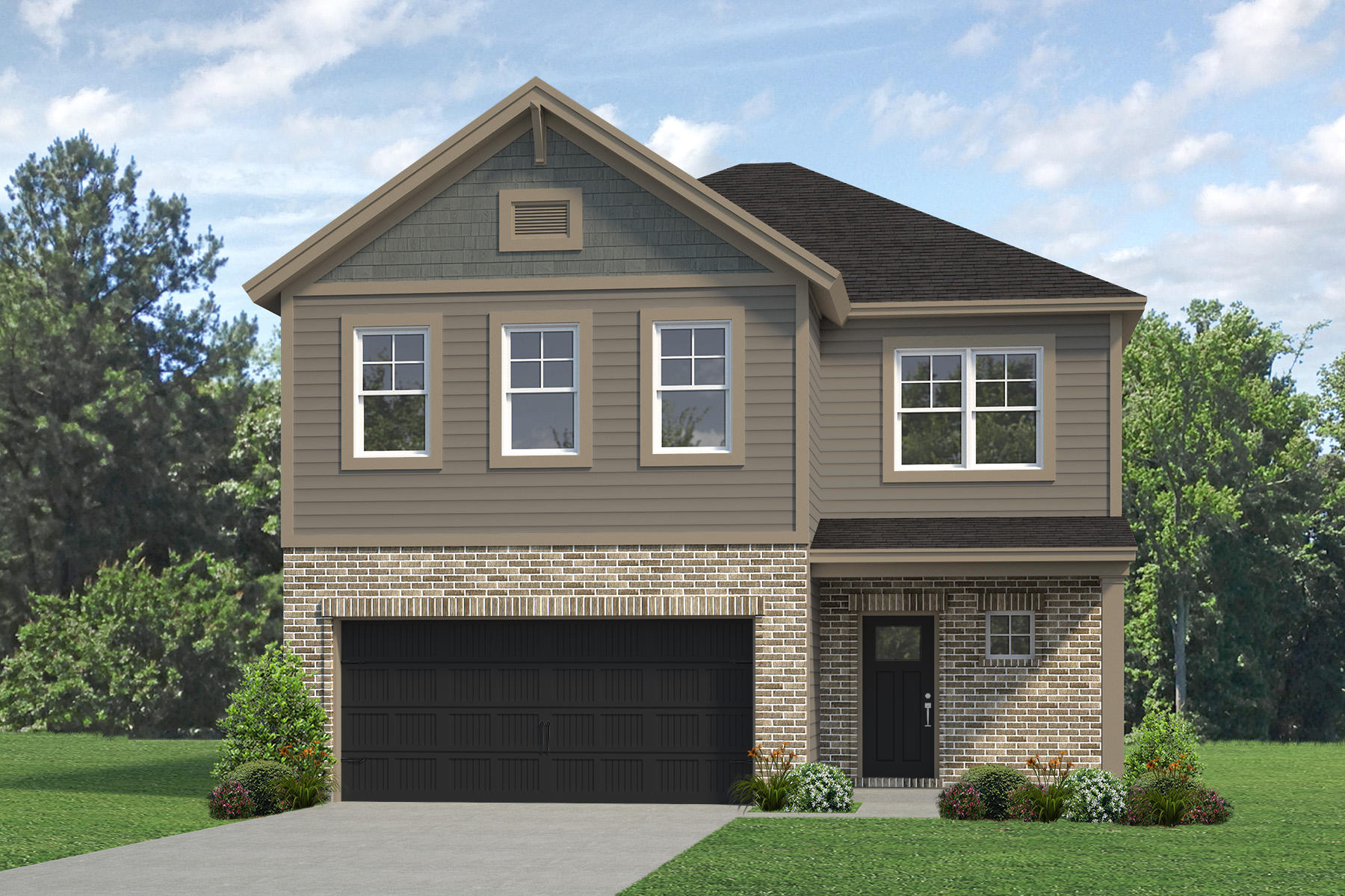 make this rendering more interesting but do not change the colors or any structural aspects of the home make it a bright sunny spring day