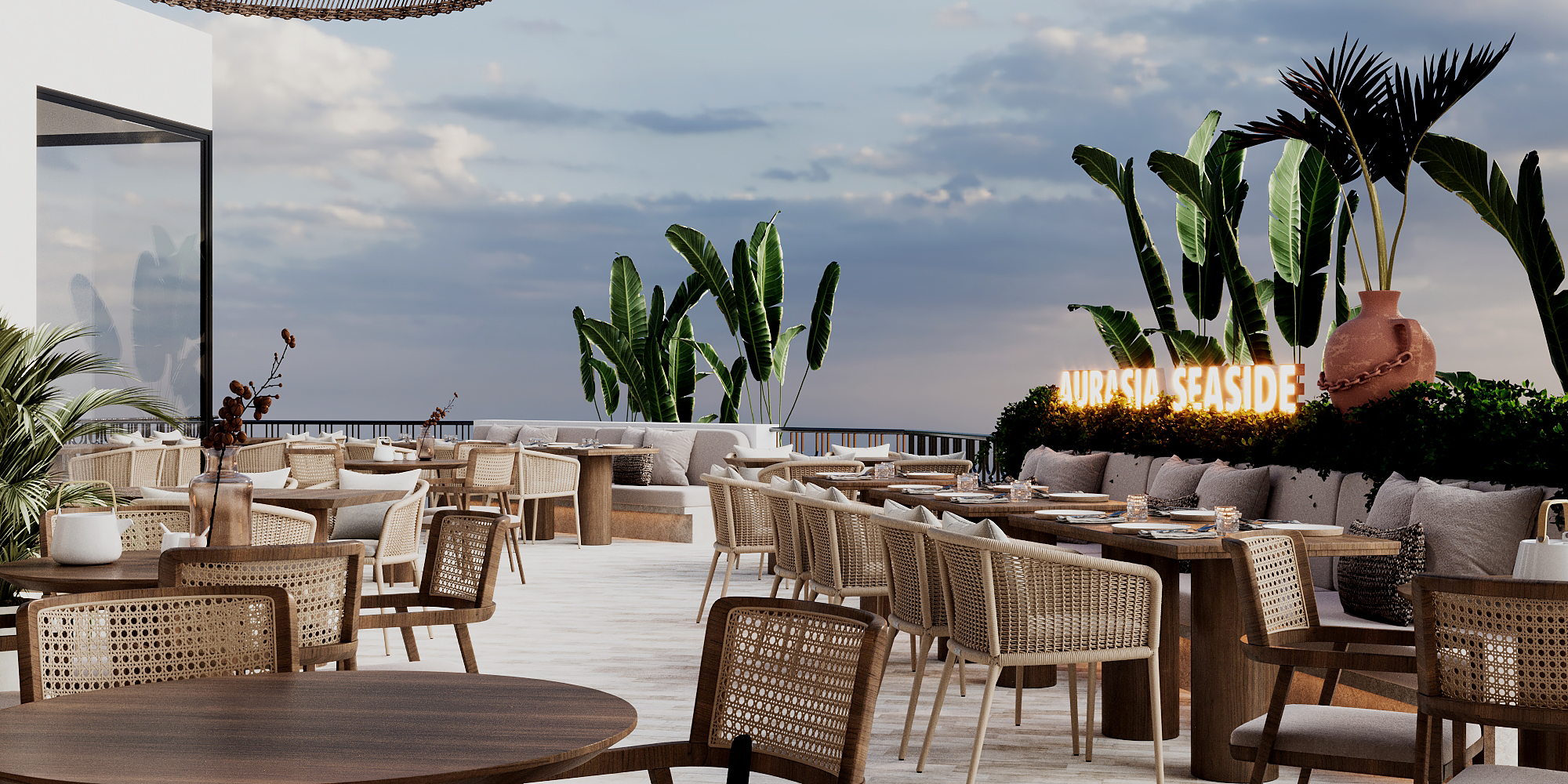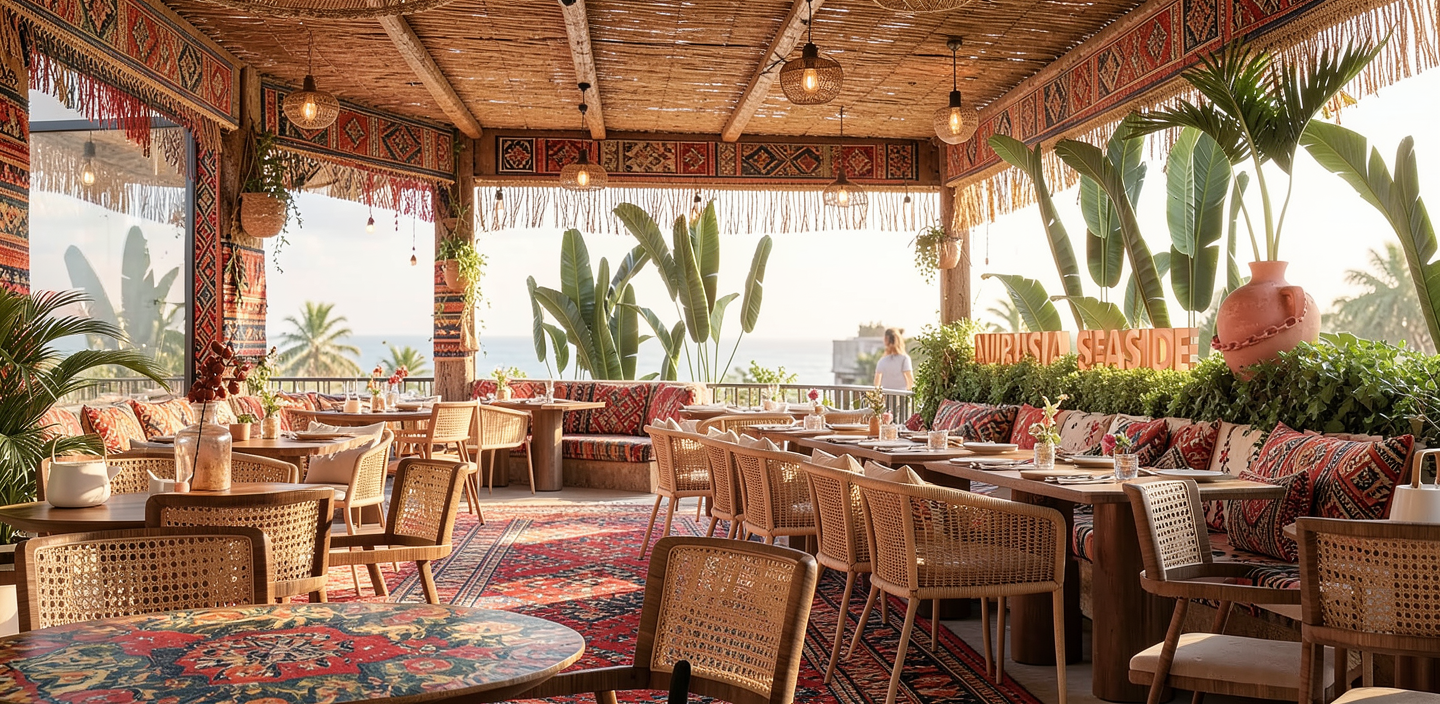 bohemian concept open air restaurant with ethnic patterns regional rug on the floor