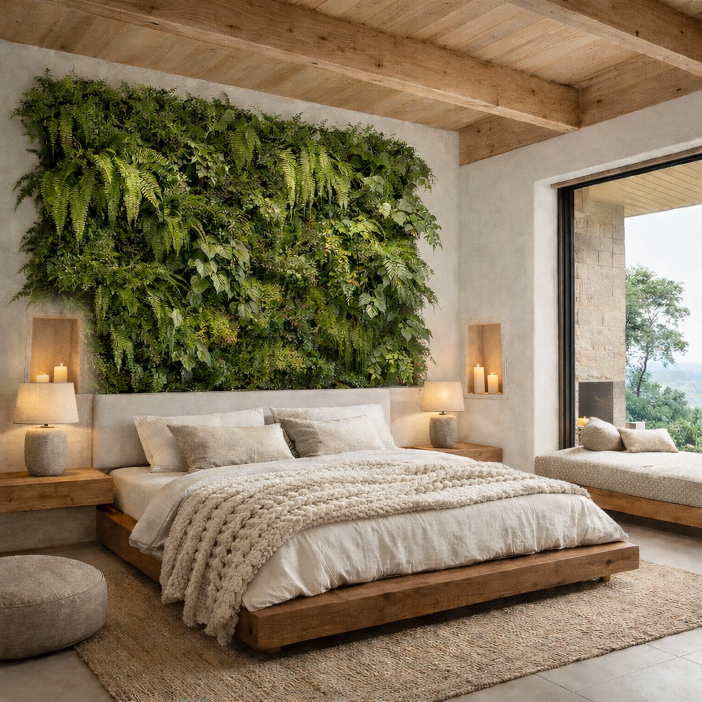 create photorealistic magazine editorial image use lamps and bed frame with organic bedding with knit throw on bed