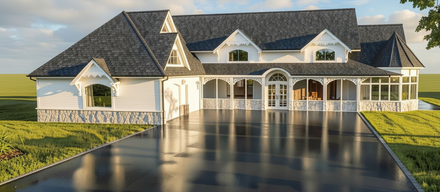 create a high end looking victorian style home with white woodwoking and details the siding should be painted a light blue color the roof is charcoal gray the home is set in a meadow surrounded by forest