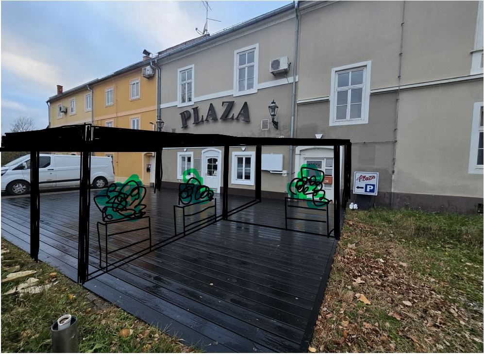 make a realistic canopy pergola on the wooden terrace in the outlines indicated by the sketch place rectangular pots with plants in the marked places