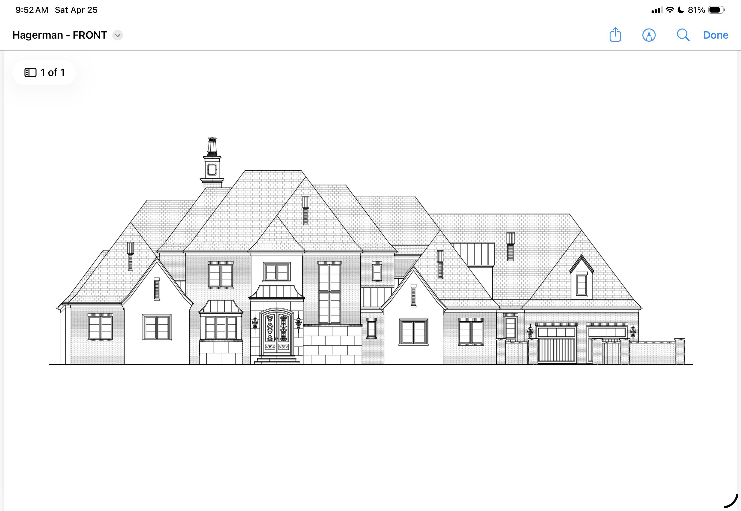 french country design slate gray roof black windows and eaves light brown brick and commercial like cut cast conc panels for stone natural stone to be mixed gray and brown stones lush landscaping vibrant blue sky in and out drive with garage on the right slight view from the left maintain all geometry and details