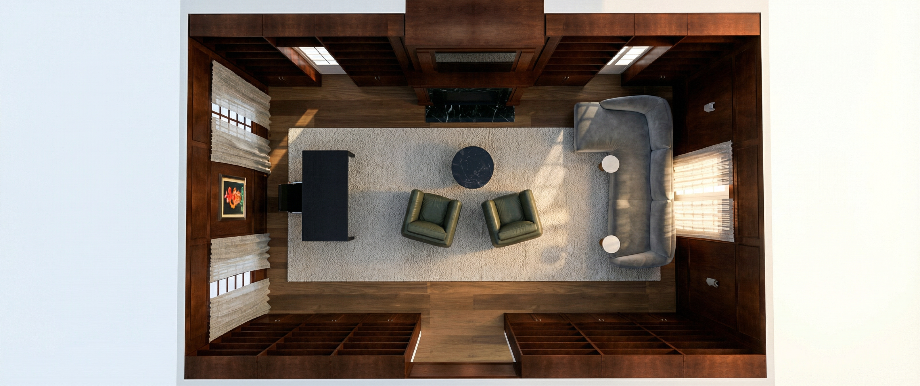 convert this floor plan into a realistic isometric 3d view of a full house show the space from an elevated angle with furniture walls and details visible use the same furniture as shows on the plan do not change the orientation of the floorplan