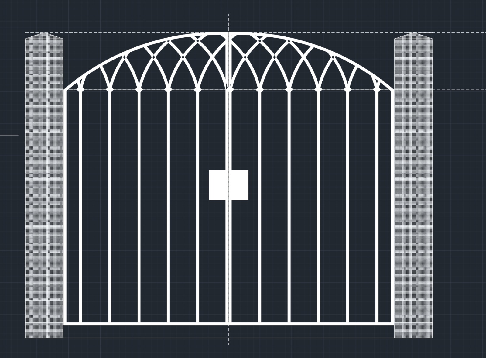 a metal gate made of steel in two leaves with a central opening and positioned between 2 pillars made of white concrete blocks architecture
