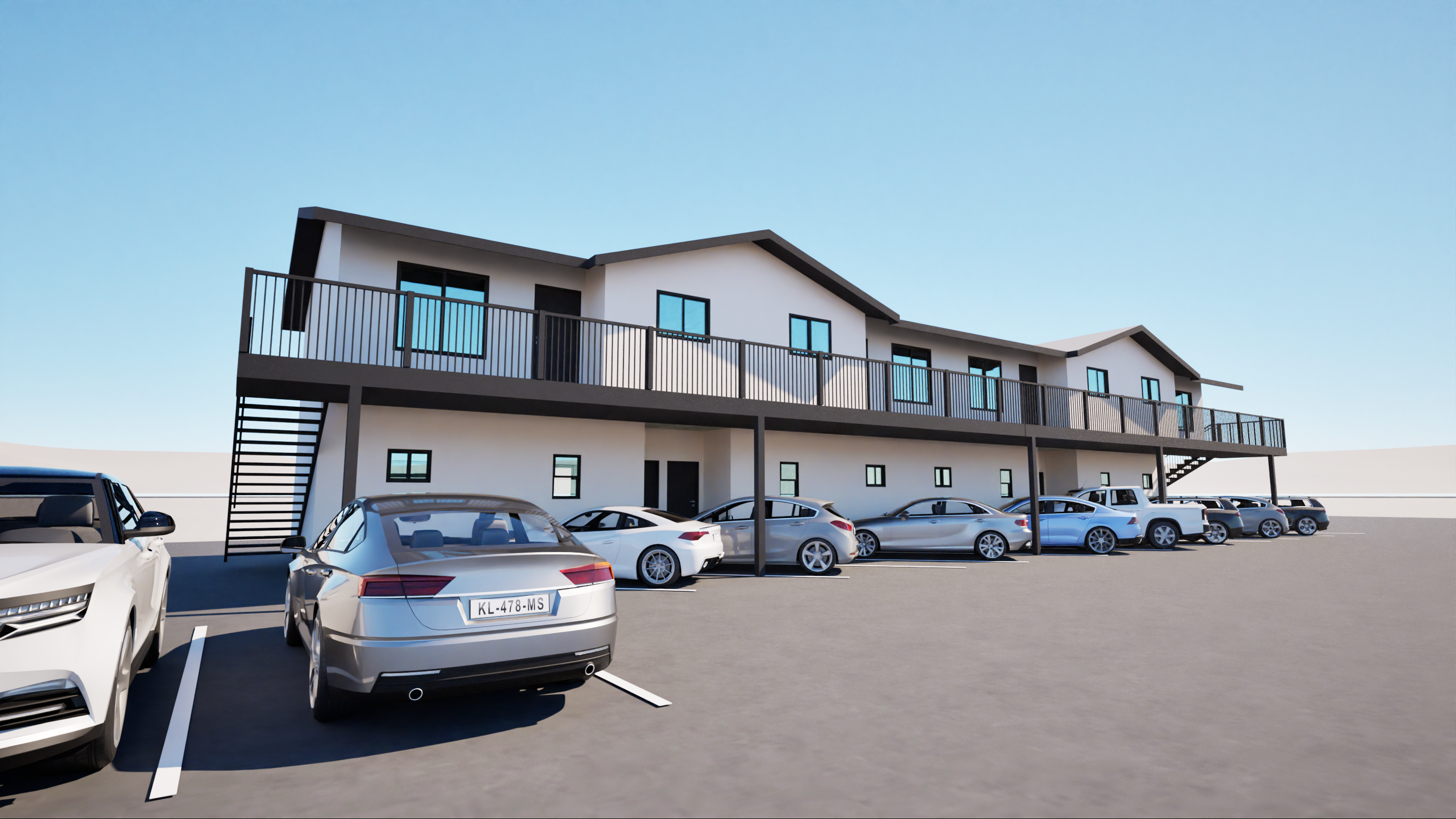smooth white plaster walls matt black deck and railings and posts black roof with black exposed rafter tails bright sunrise day with california native plants and large oak trees and cypress trees