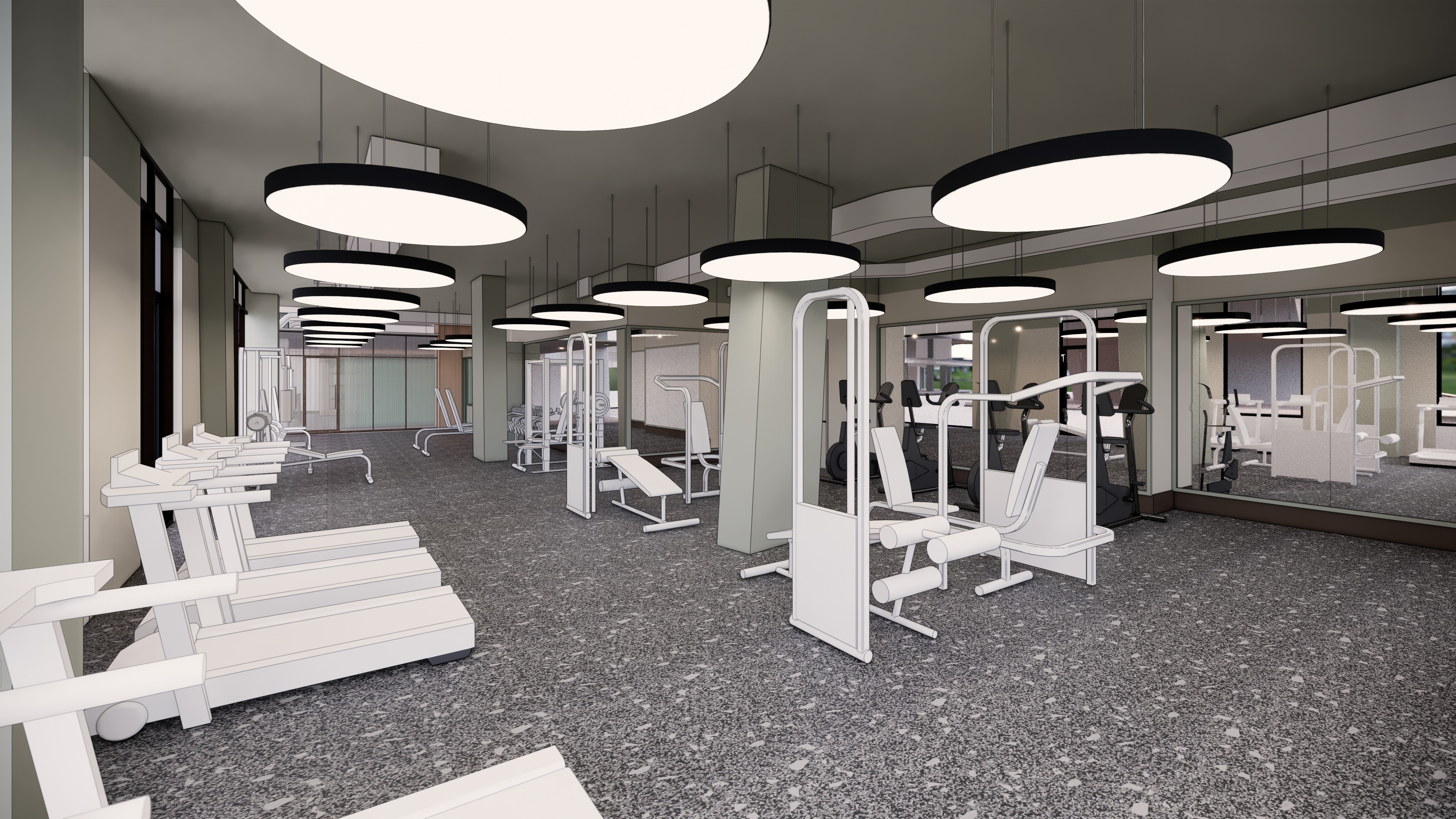 sunny day exposed ceiling and ductwork painted sage green gym equipment is black mirrors are backlit