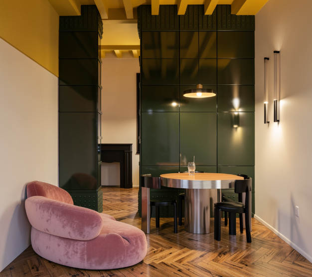 i muri rosso scuro il mobile ora verde in rosso scuro le sedie interamente in legno nero laccate le luci molto piu soffuse non cosi dirette le du eapplique a destra accese togli il lampadario sul tavolo la camera che si vede in fondo falla giallo scuro