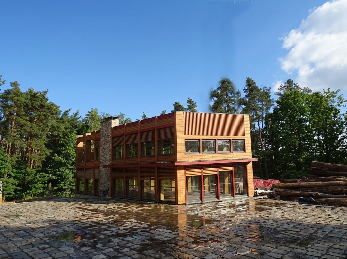 mill house vertical wood shiplap covered bridge with large grid windows driveway with jeep foreground tall grass throughout fog trees in background