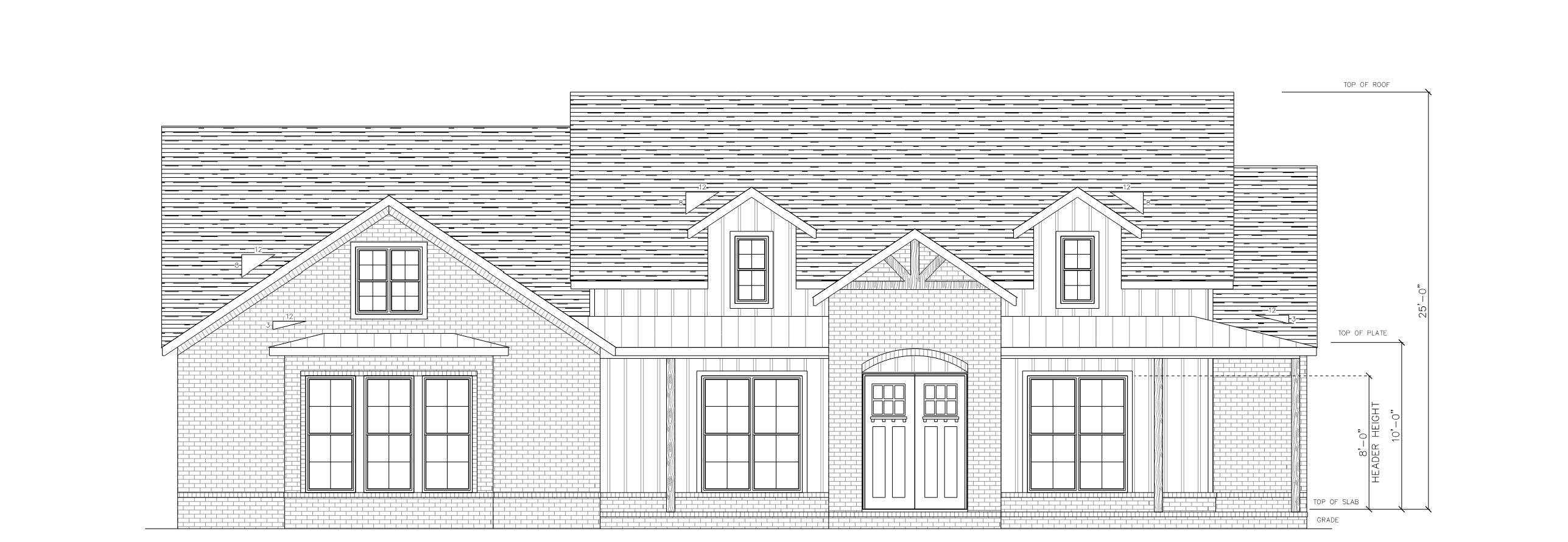 photorealistic front elevation rendering of a single story home exterior features a combination of brick and board and batten vertical siding three gabled dormers on a steep shingle roof centered arched front entry door with glass panel sidelights and a covered porch large multi pane casement windows symmetrically placed across the facade left wing features a brick gable with large picture window roof pitch approximately 12 12 plate height 10 feet total roof height 25 feet lush green front lawn mature trees blue sky with soft clouds warm afternoon sunlight casting soft shadows on a 2 acre lot within mature pine trees in a residential setting highly detailed architectural photography style 4k picture that could be used for listing photos i need the doors to be black with a 3 4 glass entry and a black frame the house needs to have a more european color with light colored bricks and black window frames also remove the sizing text from the picture add wall mounted exterior lights on the two front entry columns also remove the wooden piece on the gable of the front entry column and replace with a vertical rectangle vent remove the window above the left picture window and replace with a vertical rectangular vent also