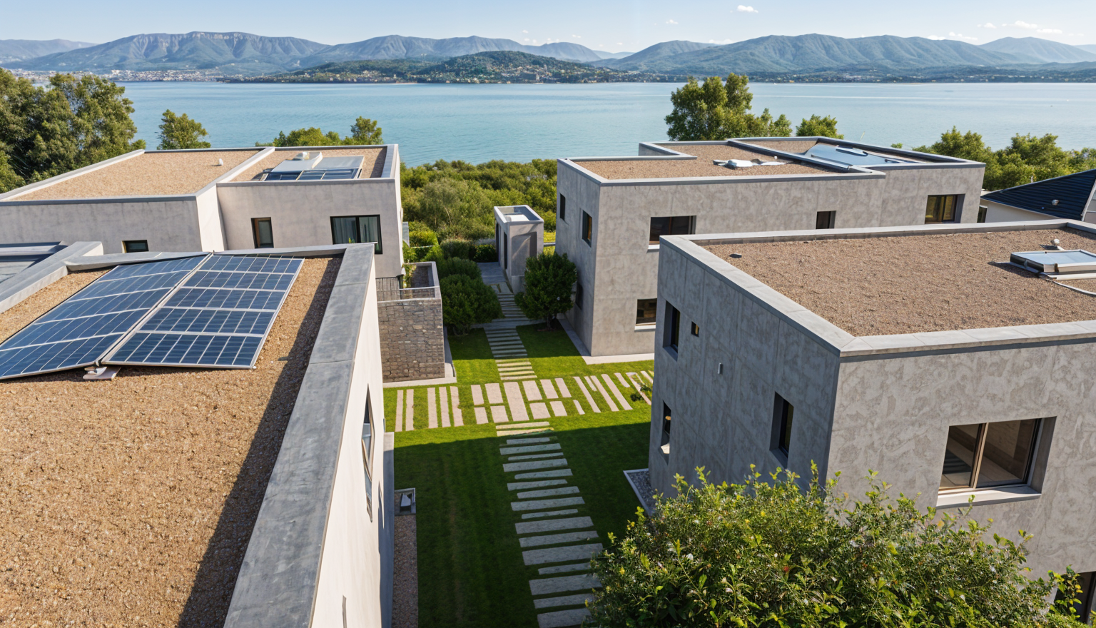 render a luxurious beachfront resort complex with modern warm minimalistic architecture