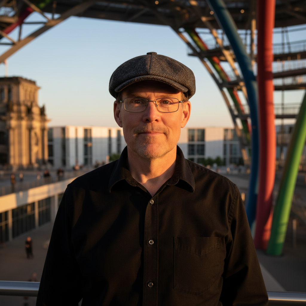 le corbusier night shot place in architecture low lighting black button down remove face wrinkles add wire rim glasses and a peaky blinders cap architecture