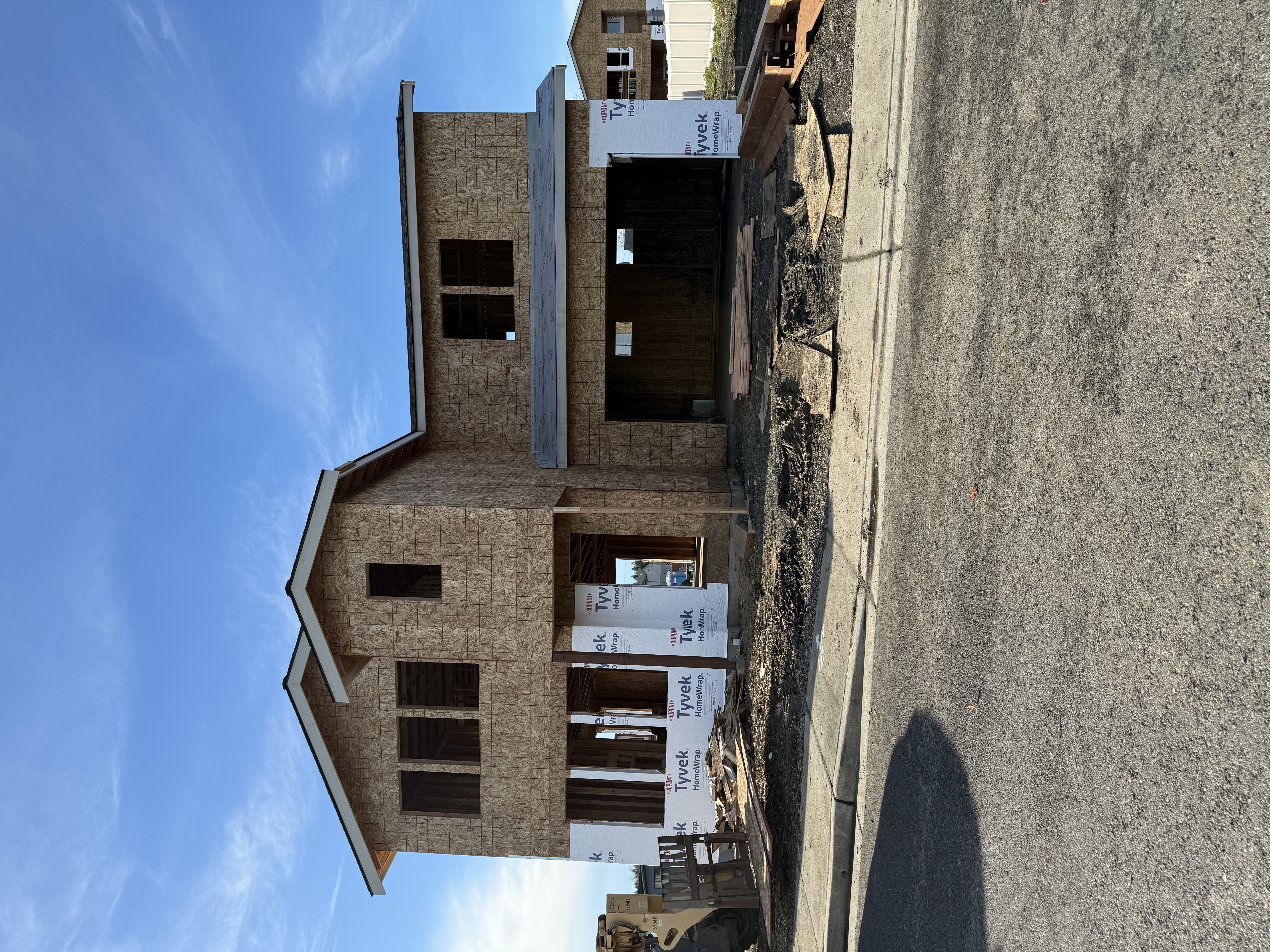 make the house an off white color with black windows and beige garage door and beige front door add irregular beige rock to the beams continuing up to the top in that section