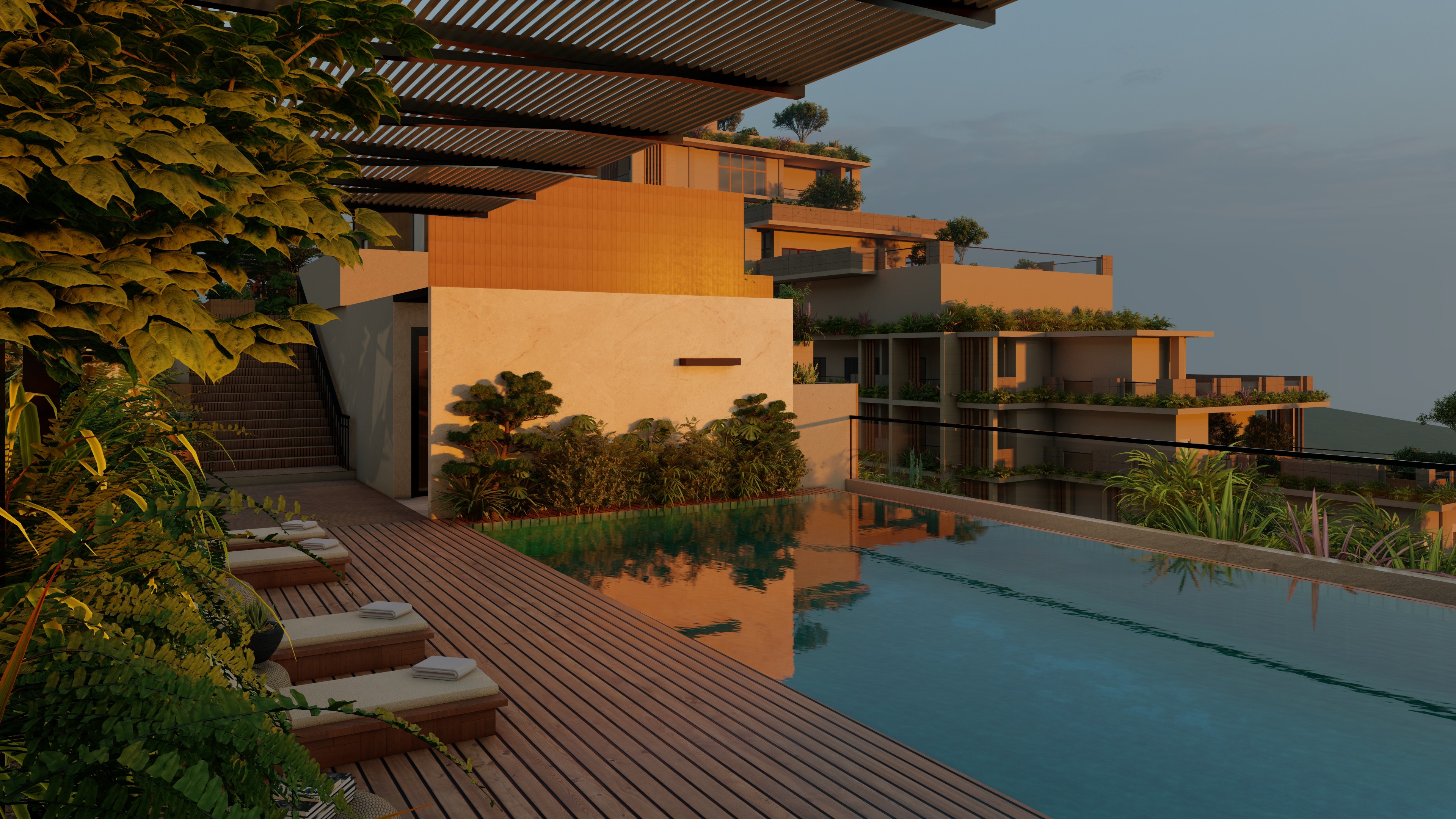 sunset lighting modern contemporary materials in warm gray tones wood nonslip tiles photorealistic 4k resolution 16mm camera lens san mateo rizal valley in the skyline looks like a real estate photograph not a 3d render make the view in a valley hill side with city view