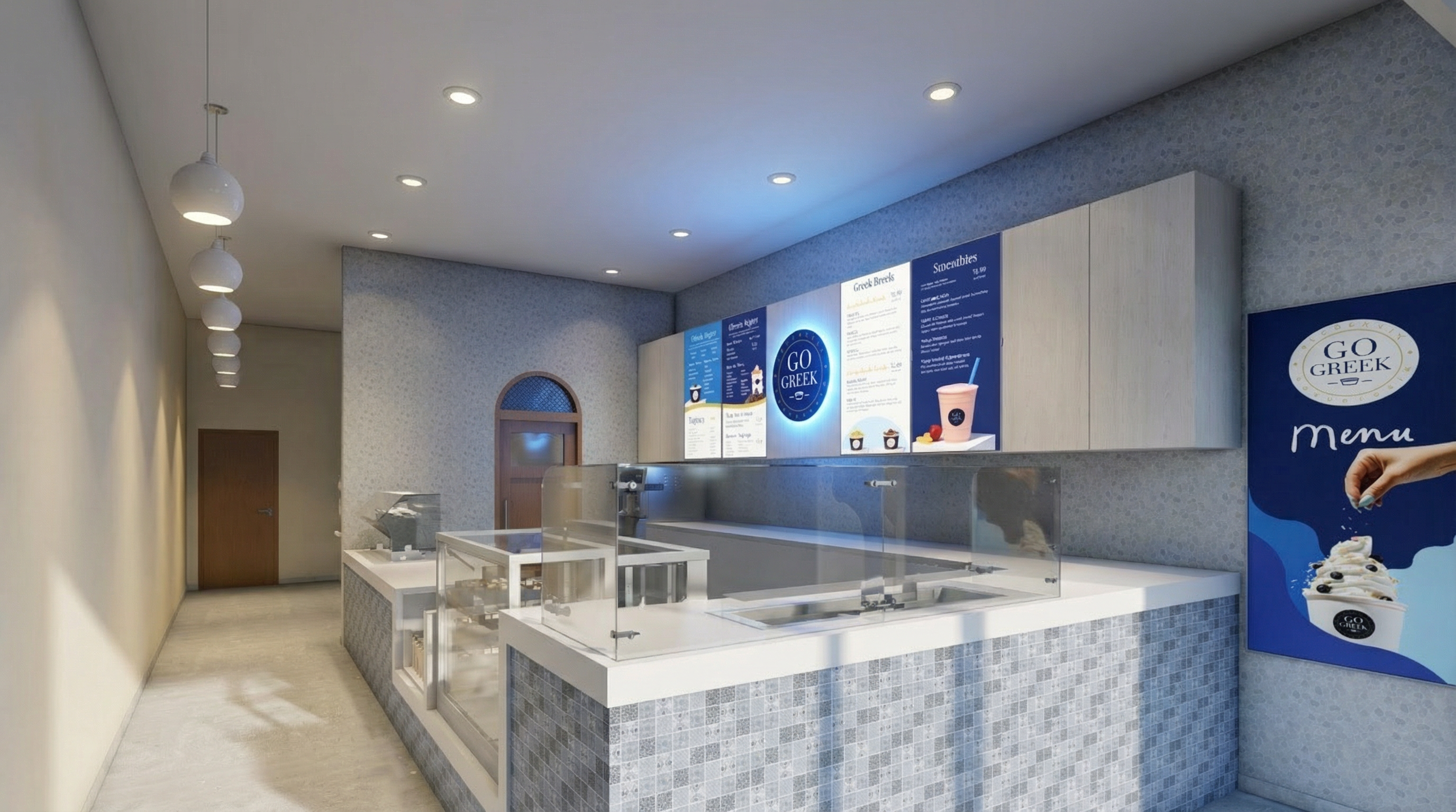 interior artificial lighting bright space no sunlight blue backlit go greek on white wood grain cabinets semi cool colors