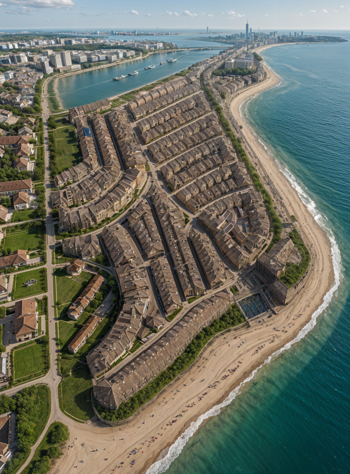 a 3d visualisation of this city based on the 2d overlay city plan give each lot one modern cubic style futuristic house and a garden render the beachclub at the beach the port and the port club