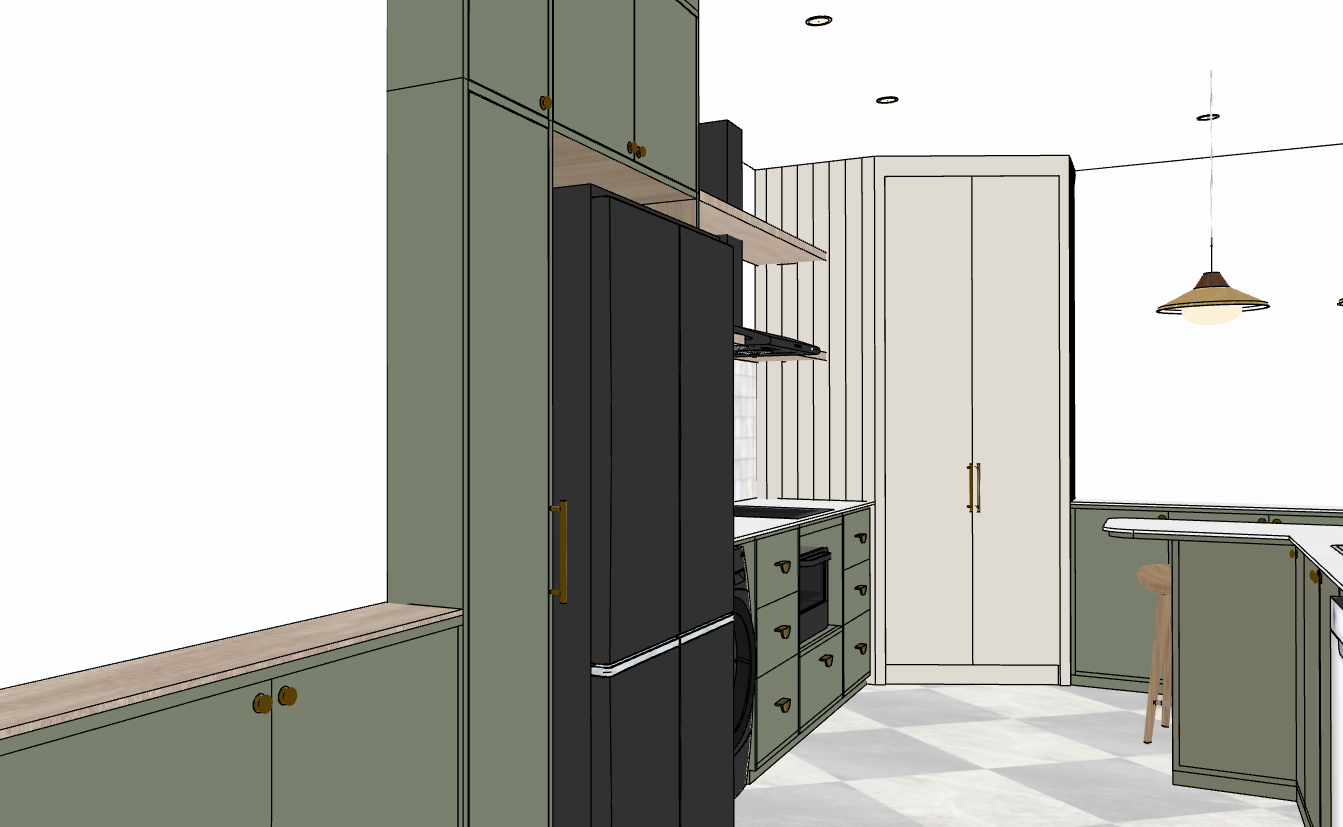 modern minimalist kitchen with sage green cabinets and cream cabinet at the end of the wall