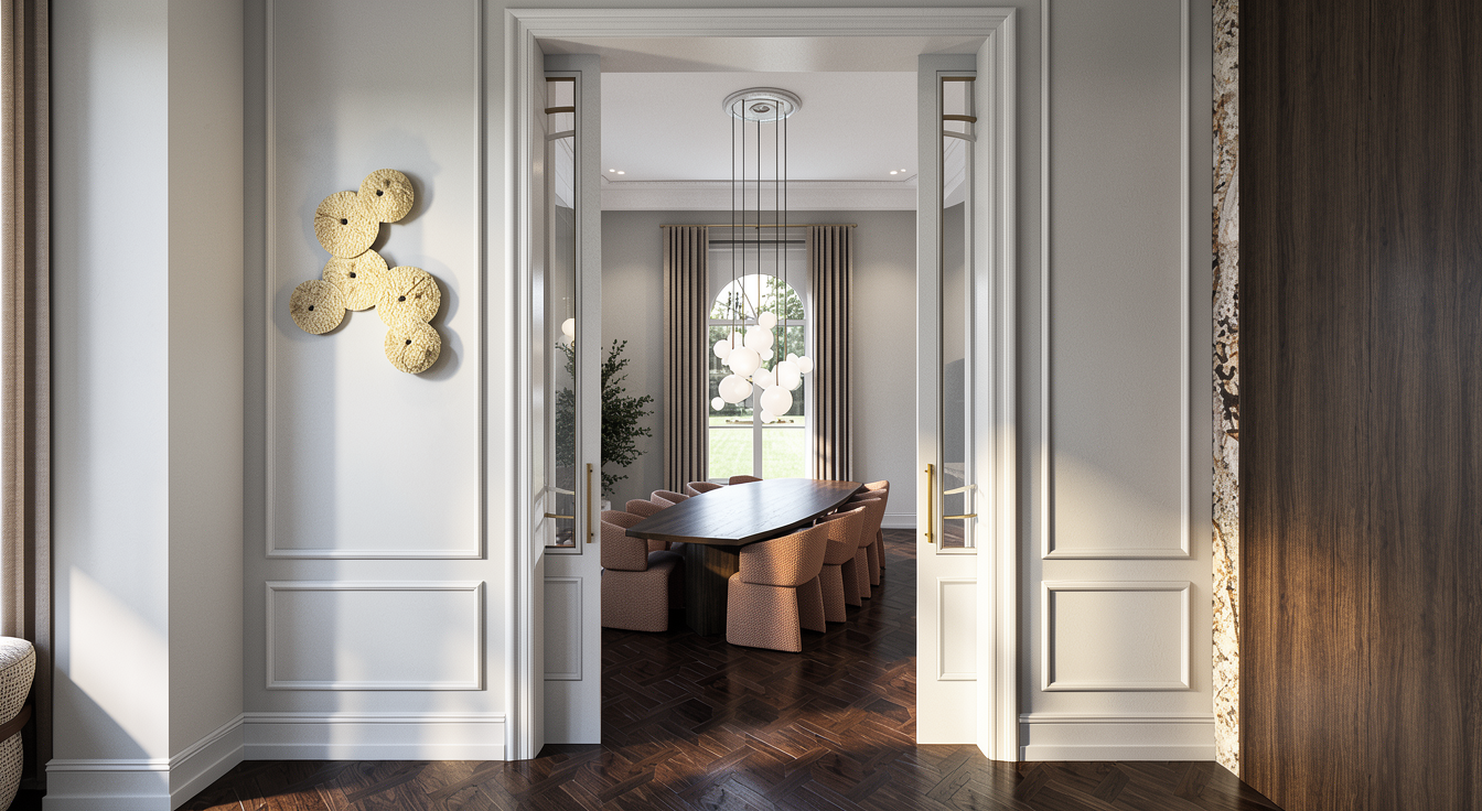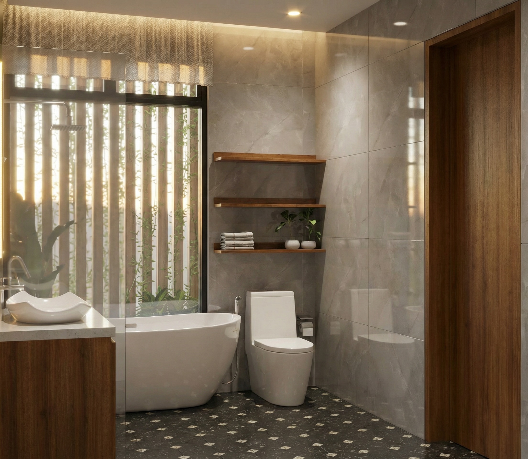 change the wall with glossy light cream keep the the texture like that and the floor using white matte mozzaic tiles with black dots