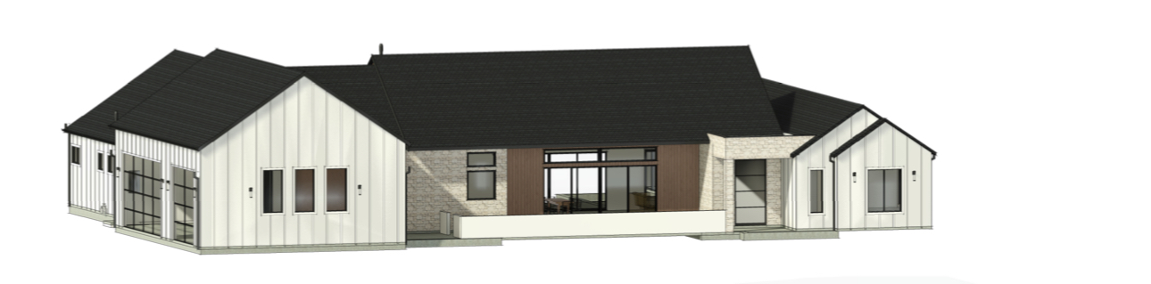 place this home on an oak wooded forest with large grass area around it make the white wood dark and add texture to all elevations add driveway