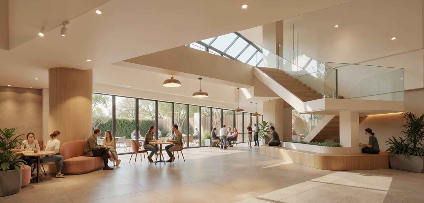 use the uploaded image strictly for geometry proportions window placement roofline stairs and composition do not alter the building structure or redesign any architectural elements use the reference image only for material realism lighting quality shadow depth and overall photographic mood do not copy any architectural features from the reference convert the uploaded building into a realistic architectural photograph with the same level of surface detail lighting behavior and environmental realism as the reference image front fa ade material red interlocking square shingles arranged in a brick like running pattern these are shingles not brick introduce subtle tonal variation natural seams slight irregularities and realistic surface depth side wall smooth modern gray panel material with subtle joints and soft natural shadow gradients railings black powder coated steel with realistic reflectivity and minor wear glass natural outdoor reflections from surrounding buildings and trees balanced glare realistic transparency stairs poured concrete with subtle aggregate texture and natural edge wear lighting natural midday sunlight with defined but realistic shadow direction soft ambient bounce light no flat cg lighting environment realistic urban residential context with similar height apartment buildings nearby natural landscaping variation subtle sidewalk texture and real outdoor atmosphere camera architectural photograph shot at street level with a 50mm full frame lens at f 5 6 natural depth slight lens distortion no render style sharpness color grading natural daylight color science no hdr no hyper polished rendering look make this look like a real photograph taken outdoors not a 3d render